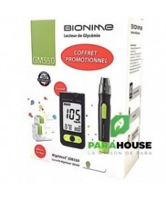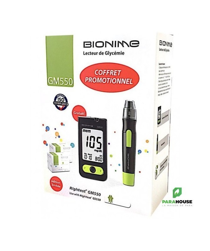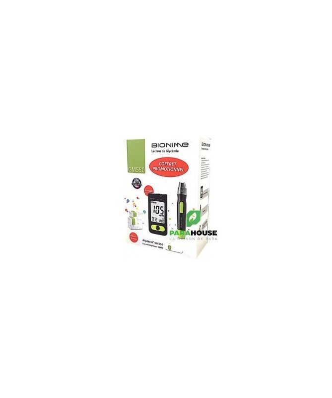 Bionime est un modèle haut de gamme avec de nombreuses fonctions avancées. La fonction de codage automatique rend l'appareil facile à utiliser. Conception de rétro-éclairage permet aux gens de lire le résultat du test, même dans l'obscurité. Avec son exactitude et de précision, le GM550 a attiré beaucoup d'attention des utilisateurs professionnels.Auto codage (brevet en instance)Contre-jourNobel Métal bande d'électrodeHaute précision et de précisionGrand écran - facile à lireSang minuscule taille de l'échantillonLa mesure précise en quelques secondesLe volume de l'échantillon de sang: 0.75µLTemps de détection: 5 secondesMémoire: 500 ensemblesTest Range: 10/20-600 mg/dl (1.1 -33.3mmol/l)Dimensions: 90 x 46 x 16.5 mmPoids: 53 g (avec piles)