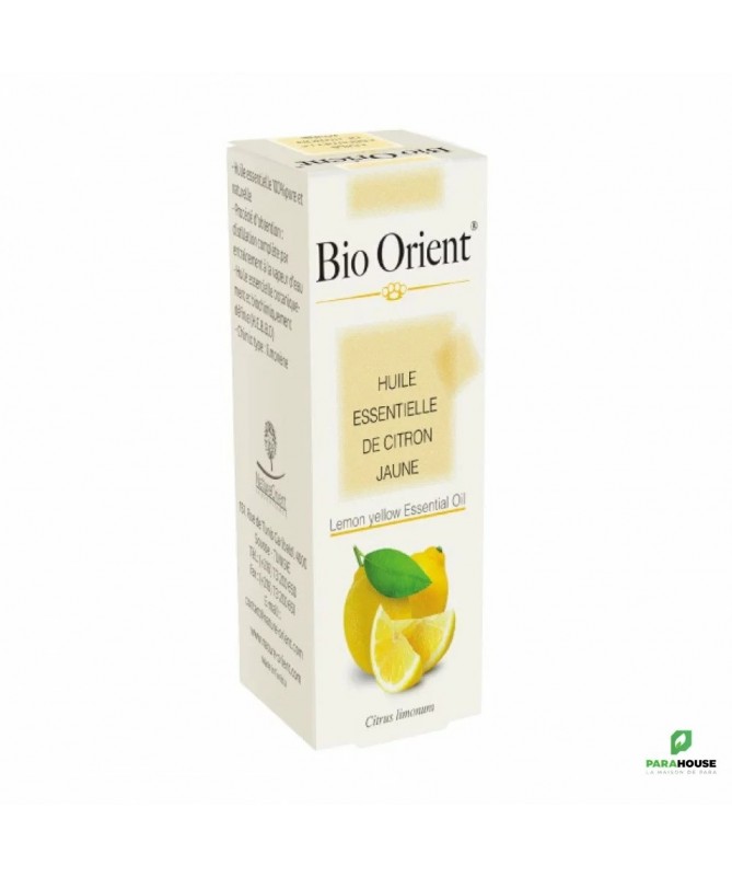 BIO ORIENT Huile essentielle de Citron Jaune 10ML Les propriétés de l’huile essentielle de citron s’expliquent par la présence de composés actifs à l’origine présents dans les feuilles de Citrus limonum (Citron Jaune, Citrus Limon). Anti-infectieuse Carminative, digestive, lipolytique, cholérétique et laxative Antinauséeuse Antiseptique aérienne Antiseptique des voies respiratoires Revitalisante générale BIO ORIENT Huile essentielle de Citron Jaune est antiseptique, astringente et cicatrisante cutanée Pour le bien-être Un tonique et stimulant général Stimulante psychique Tonique psychique et nerveuse Indications de l'huile essentielle de citron Grâce aux nombreuses propriétés décrites précédemment, l’huile de citron présente de multiples indications. Les Infections virales et bactériennes Les propriétés antivirales de l’huile permettent de l’utiliser en traitement de toutes les infections d’origine virale ou bactérienne. En diffusion atmosphérique, elle a une grande efficacité. Les déficiences immunitaires Les troubles cutanés: ses propriétés antibactériennes incitent à l’utiliser contre les cheveux gras, les dermatoses (affection cutanée : psoriasis, eczéma, etc.) et les peaux grasses. Les troubles de la circulation et l’hypertension Les insomnies, angoisses Pour le bien-être Angoisse et anxiété Asthénie (et fatigue intellectuelle) Concentration Confiance en soi (manque) Convalescence Créativité Déprime saisonnière, humeur vacillante Entrain (manque), fatigue Pessimisme