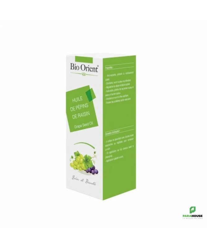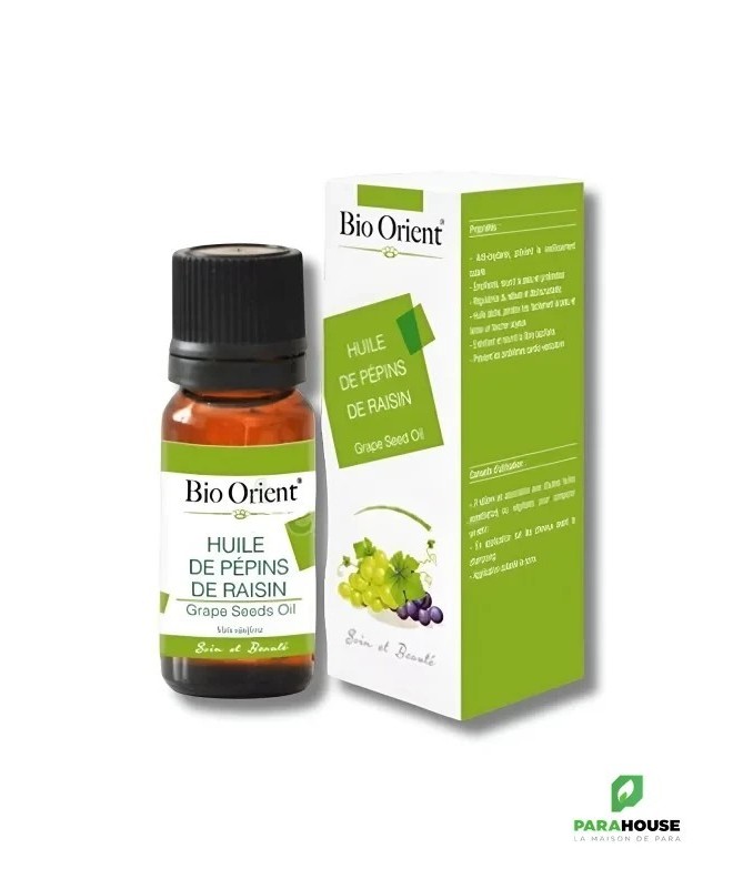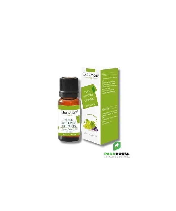 Huile de Pépins de Raisin –Vitis viniferaBienfaits- Antioxydante & Anti-âge: protège la peau du vieillissement prématuré.- Émolliente & Nourrissante: hydrate en profondeur, adoucit la peau.- Régulatrice du sébum: idéale pour les peaux mixtes à grasses.- Huile sèche: pénétration rapide, fini non gras et soyeux.- Soin capillaire: nourrit et protège les cheveux.- Bienfaits cardiovasculaires: aide à prévenir les troubles cardio-vasculaires (usage alimentaire).Conseils d’utilisation- À mélanger avec d'autres huiles végétales ou essentielles pour créer un soin sur-mesure.- Appliquer sur les cheveux en masque avant shampoing.- Appliquer le soir sur la peau, en soin de nuit.Détails techniques- Procédé d’obtention: Première pression à froid- Partie utilisée: Pépins de raisin- Nom botanique:Vitis vinifera- Origine: Tunisie- Qualité: 100 % pure, naturelle et viergeComposition- Oméga-6 (acide linoléique): 63,30 %- Oméga-9 (acide oléique): 21,69 %- Composés phénoliques: antioxydants puissants- Vitamine E: antioxydant naturel