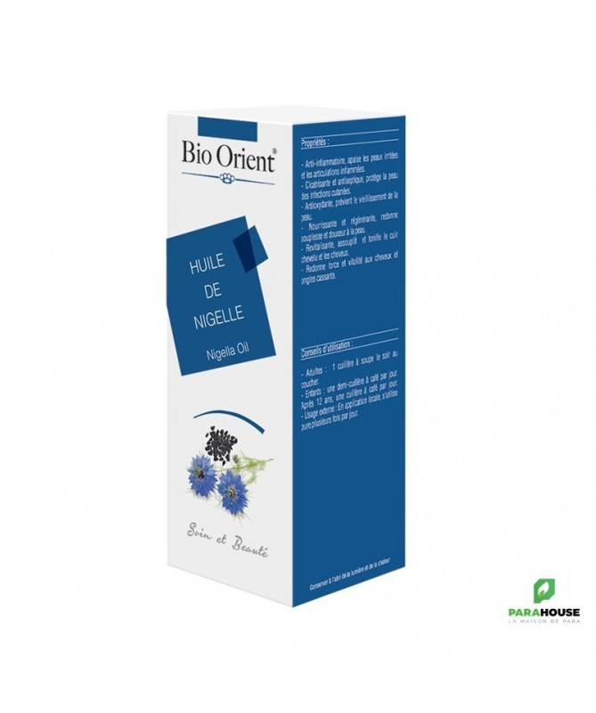 Description :Anti-inflammatoire, apaise les peaux irritées et les articulations inflammées.Cicatrisante et antiseptique, protège la peau des infections cutanées.Antioxydante, anti-âgeNourrissante et régénérante, redonne souplesse et douceur à la peau.Revitalisante, assouplit et tonifie le cuir chevelu et les cheveux.Redonne force et vitalité aux cheveux et ongles cassants.Conseils d’utilisation :Adultes : 1 cuillère à soupe le soir au coucher.Enfants : une demi-cuillère à café par jour. Après 12 ans, une cuillère à café par jour.Usage externe : En application locale, s'utilise pure plusieurs fois par jour.Composition :Oméga-6 : 56.30%Acides gras mono-insaturés :Oméga-9 : 24.30%Huile essentielle de Nigelle : 0.14%Thymoquinone : 33.35%Para-cymène : 38.87%Nigelline