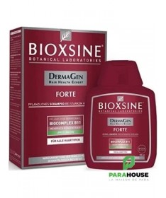 Bioxsine Dermagen Forte Shampoing Perte intense 300ML Bioxsine Dermagen Forte Shampoing Perte intense est basé sur une formule active à base de plantes BioComplex B11 à partir de phyto-extraits spécialement combinés pour réduire efficacement la chute des cheveux et favoriser la croissance des cheveux pour des cheveux plus épais et plus forts. Les actifs efficaces contre la chute des cheveux sont alimentés par la technologie des liposomes. Des tests d'efficacité ont prouvé que le shampooing Bioxsine Forte aide à prévenir la chute des cheveux lorsqu'il est utilisé de manière continue et régulière, favorise la croissance des cheveux et revitalise les racines des cheveux faibles et fournit de la résilience, du volume, de la brillance et de l'éclat aux cheveux. Résultats : 100% de diminution de la chute des cheveux, 93% de cheveux plus forts, 83% de fibres capillaires plus épaisses,