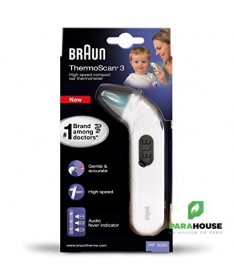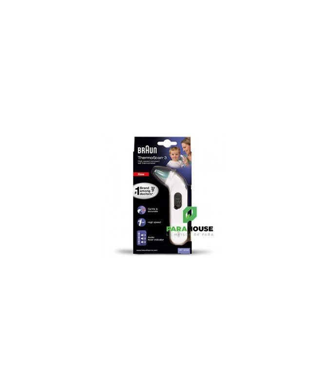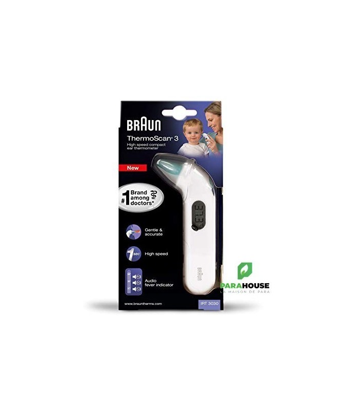 Grâce à sa conception compacte, le Braun ThermoScan®3 (IRT 3030) est facile à utiliser, doux et rapide. Il prend des mesures en une seconde seulement et aide à interpréter la température avec son indicateur de fièvre audio.La marque la plus utilisée et la plus recommandée par les médecinsDoux et précisIndicateur de fièvre audio1 bip pour une température normale, 2 bips pour une température élevée et 4 bips pour une température forteMesure en une secondeConvient également aux nouveau-nésCouvercle du compartiment à piles conçu avec un verrouillage de sécurité pour empêcher tout risque d’étranglementRappel de la dernière mesure pour un suivi de la températureEmbouts jetables hygiéniques