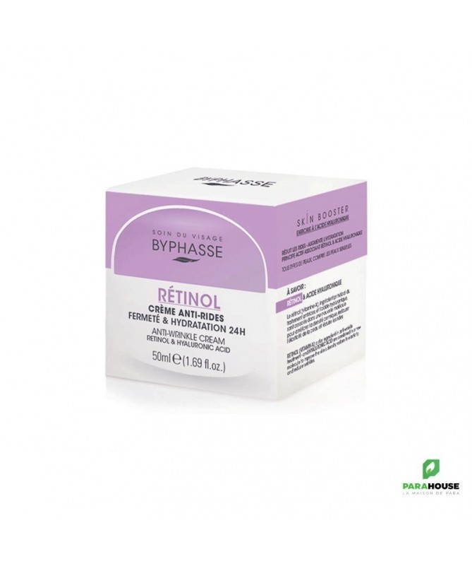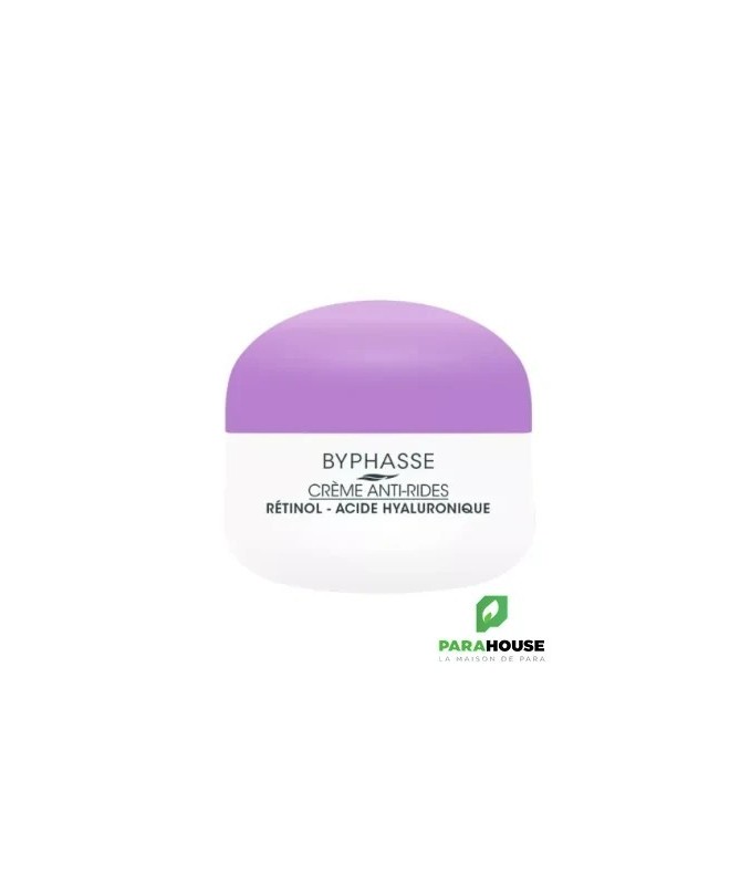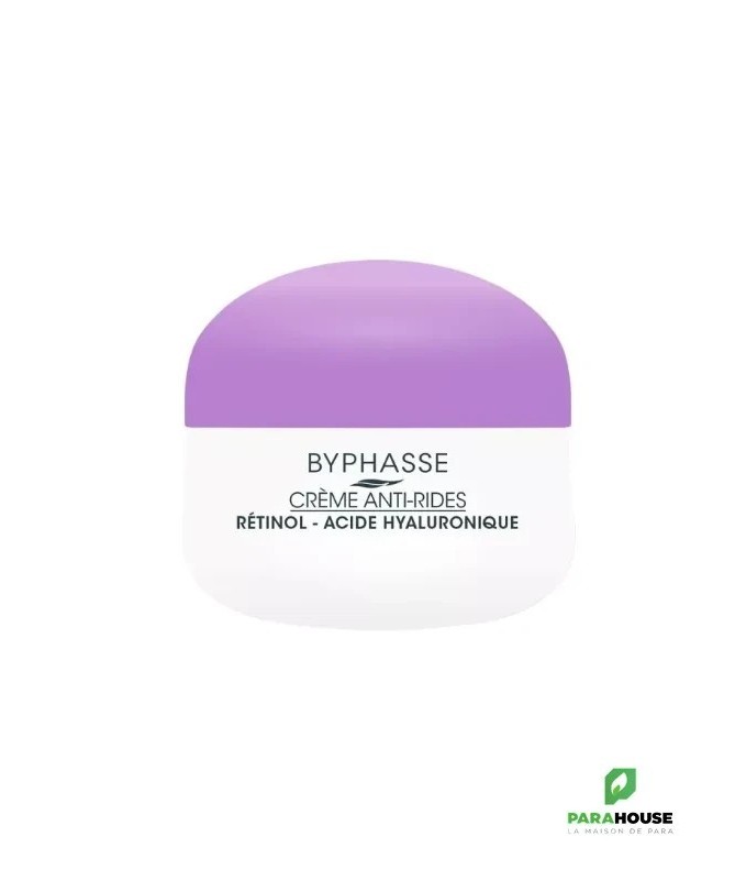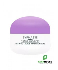 Description :La crème anti-rides Byphasse contient un principe actif innovant qui associe le rétinol à l'acide hyaluronique. Il améliore l'apparence des rides profondes et des rides d'expression, donne de l'élasticité à la peau et la maintient hydratée pendant 24 heures. La peau est plus ferme, plus lisse et revitalisée.Recommandation : utiliser en soin de nuit.Bénéfices :– Principe actif combinant le rétinol et l’acide hyaluronique– Fermeté et hydratation 24h– Améliore l’apparence des rides profondes– La peau est plus lumineuse et plus éclatante– Sensation non grasse à l’applicationConseils d'utilisation :Appliquer le soir sur la peau parfaitement nettoyée du visage et du cou, en massant doucement avec les doigts du centre vers l’extérieur, en évitant le contour des yeux, jusqu’à absorption complète.Ingrédients :Le rétinol (vitamine A), ingrédient principal du traitement antirides, et l’acide hyaluronique, sont associés dans une nouvelle molécule pour améliorer la densité dermique, restaurer l’élasticité de la peau et réduire les rides.La glycérine est un Ingrédient actif doté d’un grand pouvoir hygroscopique qui augmente la rétention d’eau dans la couche cornée de la peau, la maintenant douce et hydratée.Aqua (Water), Isododecane, Caprylic/Capric Triglyceride, Glycerin, Propanediol, Cetyl Alcohol, Glyceryl Stearate, Cetearyl Alcohol, Phenoxyethanol, PEG-75 Stearate, Ceteth-20, Steareth-20, Parfum (Fragrance), Disodium EDTA, Xanthan Gum, Acrylates/C10-30 Alkyl Acrylate Crosspolymer, Ethylhexylglycerin, Hydrolyzed Jojoba Esters, Sodium Hydroxide, Glycine Soja (Soybean) Oil, Sodium Retinoyl Hyaluronate, Tocopherol, Beta-sitosterol, Squalene, Sodium Chloride, CI 19140 (FD&C Yellow No. 5), CI 15985 (FD&C Yellow No. 6).