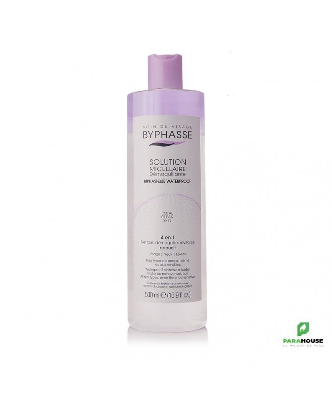 Description :La solution micellaire biphasique Waterproof BYPHASSE est une eau démaquillante et nettoyante de dernière génération qui combine deux phases : la phase aqueuse avec des micelles (des petites particules de tensioactifs) qui nettoie et rafraîchit la peau, et la phase huileuse qui aide à éliminer le maquillage waterproof le plus résistant sur le visage, les yeux et les lèvres.À savoir : La combinaison des micelles contenues dans sa formule aqueuse et de la phase huileuse, assure un nettoyage parfait sans effet gras ni rinçage.Résultat beauté : Une peau nette et démaquillée en douceur, sans aucune trace de maquillage (même waterproof). Une sensation de douceur sur le visage, les yeux et les lèvres.Les plus du produit:• une formule adaptée à tous types de peaux, même les plus sensibles.• tolérance testée sous contrôle dermatologique et ophtalmologique.• format maxi 500 ml.• 4 en 1 : nettoie, démaquille, revitalise et adoucit.• 86% de la formule contient des ingrédients d’origine naturelle.Conseils d’utilisation :Appliquer quotidiennement sur le visage à l’aide d’un coton BYPHASSE pour un démaquillage et un nettoyage tout en douceur. Sans rinçage.Ingrédients :Aqua (Water), Cyclopentasiloxane, Isohexadecane, Glycerin, Sodium Chloride, Hexylene Glycol, Coco-Betaine, Disodium EDTA, Benzethonium Chloride, Sodium Hydroxide, CI 60725 (D&C Violet No. 2).