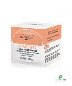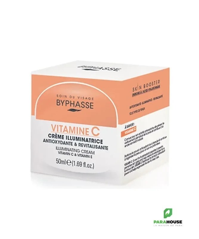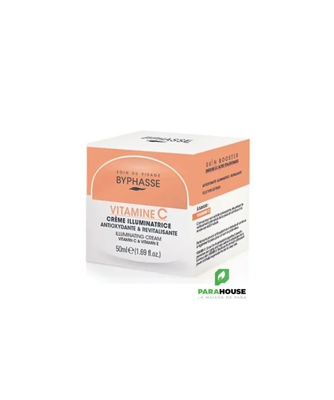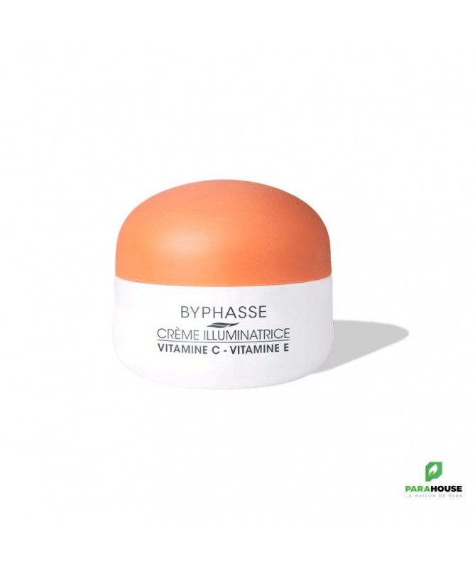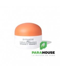 La crème illuminatrice Byphasse à la vitamine C, enrichie en vitamine E et en acide hyaluronique, aide à prévenir le vieillissement prématuré de la peau grâce à son pouvoir antioxydant. Sa formule permet d'hydrater les couches profondes de l’épiderme et d'améliorer l’élasticité cutanée. La peau retrouve son éclat naturel et un aspect plus lumineux.Bénéfices :– Enrichie à l’acide hyaluronique– Action antioxydante– Améliore l’aspect de la peau la laissant plus revitalisée– La peau retrouve son éclat naturel et son élasticité– Sensation non grasse à l’applicationConseils d'utilisation :Appliquer matin et soir sur la peau parfaitement nettoyée du visage et du cou, en massant délicatement avec les doigts du centre vers l’extérieur, en évitant le contour des yeux, jusqu’à absorption complète.Ingrédients :La vitamine C, connue pour son activité antioxydante, elle prévient le vieillissement prématuré de la peau et aide à récupérer sa luminosité naturelle.La vitamine E renforce le pouvoir antioxydant de la formule et aide la peau à se régénérer, pour un soin en profondeur.La glycérine, actif doté d’un grand pouvoir hygroscopique, augmente la rétention d’eau dans la couche cornée de la peau, la maintenant douce et hydratée.Aqua (Water), Isododecane, Caprylic/Capric Triglyceride, Glycerin, Propanediol, Butyrospermum Parkii (Shea) Butter, Tapioca Starch, Cetyl Alcohol, Glyceryl Stearate, Tocopheryl Acetate, Cetearyl Alcohol, Phenoxyethanol, PEG-75 Stearate, Sodium Ascorbyl Phosphate, Parfum (Fragrance), Disodium EDTA, Xanthan Gum, Ceteth-20, Steareth-20, Acrylates/C10-30 Alkyl Acrylate Crosspolymer, Ethylhexylglycerin, Sodium Hydroxide, Sodium Hyaluronate, Sodium Benzoate, Potassium Sorbate, Sodium Chloride, Citric Acid, Limonene, Linalool, Hydroxycitronellal, CI 15985 (FD&C Yellow No. 6).
