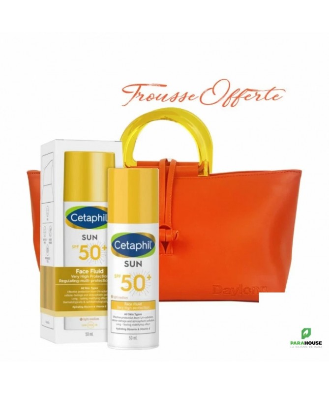 Cetaphil Sun Face Fluid Teinte SPF 50+ 50ML Cetaphil Sun Face Fluid Teinte SPF 50 est un Multi Protection Fluide régulateur qui offre une protection fiable contre la pollution atmosphérique et convient à la protection solaire quotidienne du visage. La texture ultra-légère de Cetaphil Sun Face Fluid pénètre immédiatement et procure une hydratation intense tout en ayant un effet matifiant longue durée. Le filtre UV photostable et la technologie spéciale Celligent offrent une protection UVA et UVB hautement efficace et immédiate, une protection efficace des cellules et de l'ADN et préviennent le photovieillissement. Cetaphil Sun Face Fluid est : Résistant à l'eau (eau douce et salée), Résistant à la sueur Testé dermatologiquement et ophtalmologiquement Non comédogène, Sans parfum Composition : AQUA, ETHYLHEXYL METHOXYCINNAMATE, DIETHYLAMINO HYDROXYBENZOYL HEXYL BENZOATE, C12-15 ALKYL BENZOATE, DIBUTYL ADIPATE, TAPIOCA STARCH, ETHYLHEXYL TRIAZONE, METHYLENE BIS-BENZOTRIAZOLYL TETRAMETHYLBUTYLPHENOL [nano], BIS-ETHYLHEXYLOXYPHENOL METHOXYPHENYL TRIAZINE, SORBITOL, HELIANTHUS ANNUUS SEED OIL, GLYCERIN, TOCOPHEROL, DIMETHICONE, LAURYL GLUCOSIDE, POLYGLYCERYL-2 DIPOLYHYDROXYSTEARATE, CETYL PHOSPHATE, CETEARYL ALCOHOL, BENZYL ALCOHOL, CARBOMER, DECYL GLUCOSIDE, SODIUM LEVULINATE, TRIETHANOLAMINE, CAPRYLYL GLYCOL, ASCORBYL PALMITATE, ETHYL FERULATE, SODIUM ANISATE, POLYMETHYLSILSESQUIOXANE, PROPYLENE GLYCOL, SODIUM GLYCEROPHOSPHATE, ROSMARINUS OFFICINALIS LEAF EXTRACT, XANTHAN GUM, BHT, CITRIC ACID, ALUMINA, MAGNESIUM OXIDE, CI 77499, CI 77491, CI 77492, CI 77891. Conseils d'utilisation : Appliquer une quantité généreuse de Cetaphil Sun Fluid sur la peau environ 20 minutes avant l'exposition au soleil pour permettre une absorption optimale dans la peau afin d'obtenir une résistance à l'eau optimale. Éviter le contact visuel. Appliquer plusieurs fois afin de maintenir la protection solaire. Trousse OFFERTE