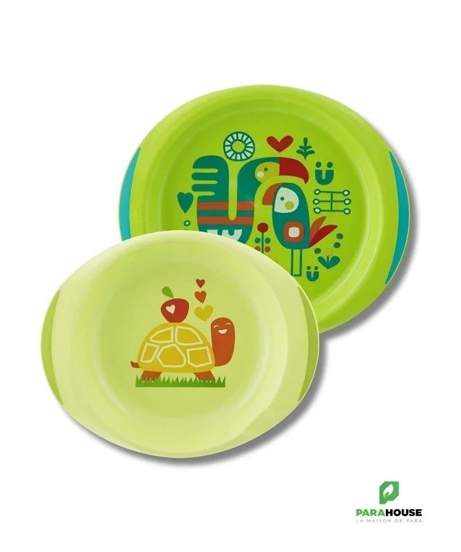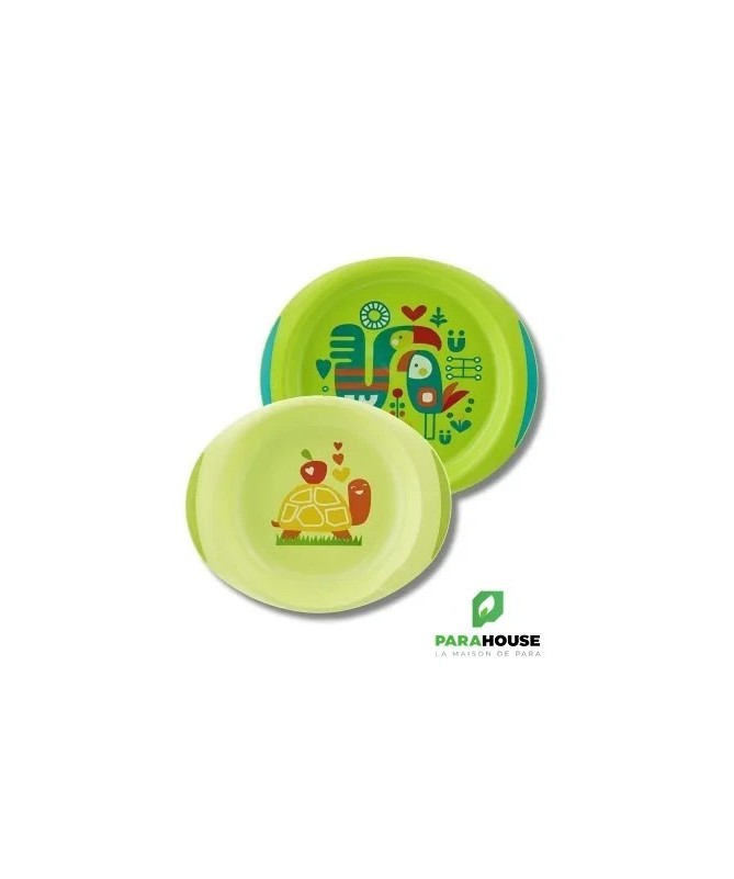 Ensemble d'une assiette plate et d'une assiette creuse avec décors ludiques pour rendre les repas plus amusants. Les rebords permettent de poser la cuillère ou la fourchette facilement. Conçu avec des bases anti-dérapantes pour plus de sécurité. L'assiette est ergonomique, facile à tenir, même pour les tout-petits, grâce à ses grands rebords. Ce premier ensemble d'assiettes pour bébé ressemble à celui des parents, et rend chaque repas encore plus agréable.- Rebords pour poser la cuillère ou la fourchette- Grand rebord pour une prise en main facile- Base anti-dérapante pour plus de sécurité- Décors ludiques pour rendre l'heure du repas amusante