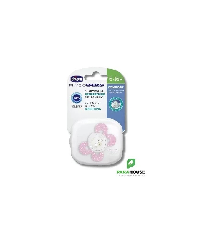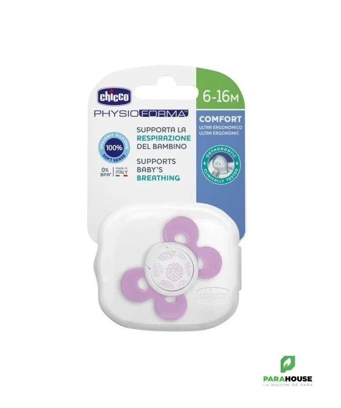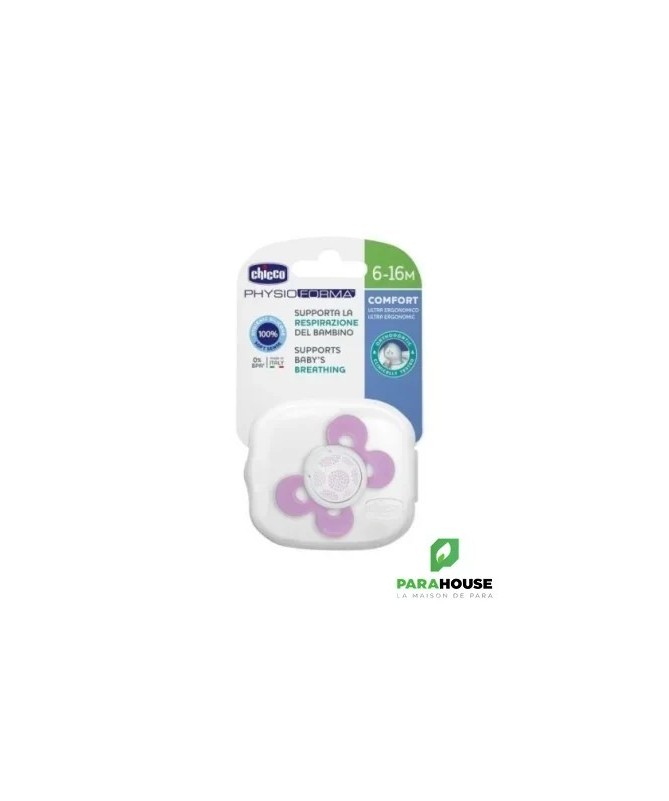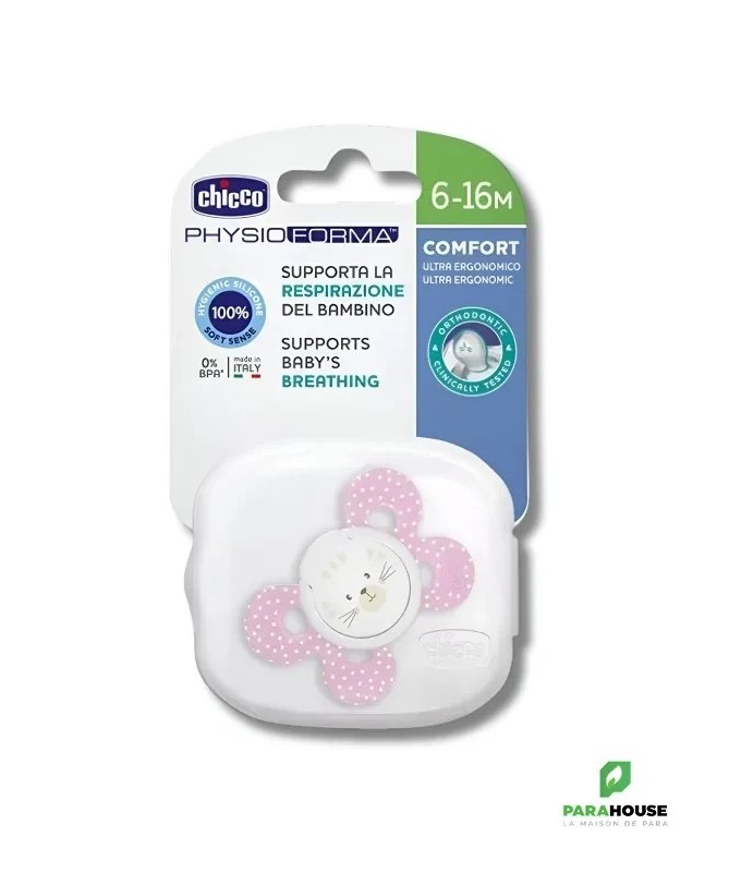 Chicco Sucette Physio Comfort - Silicone 6-16M Les sucettes Chicco PhysioForma Comfort assurent un confort optimal à votre enfant ! Elles favorisent le bon développement de la bouche de bébé et favorisent sa respiration physiologique. Spécialement conçues pour les bébés de 6 à 16 mois. La sucette Chicco PhysioForma Comfort est fabriquée en silicone, un matériau choisi pour sa praticité, son hygiène et son indéformabilité. Sa finition exclusive SOFT SENSE lui confère douceur et velouté. Caractéristiques : Forme extra ergonomique : les sucettes Chicco laissent un grand espace pour le nez et le menton de bébé, ce qui facilite les mouvements et la respiration de bébé. Soutient la respiration de bébé : PhysioForma est la forme exclusive de Chicco qui soutient la respiration physiologique de bébé en maintenant la langue dans sa position naturelle et crée ainsi des voies respiratoires ouvertes pour que bébé respire correctement. Conçues en collaboration entre des pédiatres, des orthodontistes et l'Osservatorio Chicco, les sucettes pour bébé PhysioForma sont constamment testées et approuvées. Elles favorisent activement le bon développement de la bouche de bébé et aident à soutenir sa respiration. Elles sont fabriquées en silicone, un matériau hygiénique et déformable. Délicate sur le visage de bébé : la sucette confort n'a que 4 points de contact pour assurer une extrême douceur sur le visage de bébé. Vaste espace à la base de la tétine : la tétine est positionnée pour faciliter la succion confortable de bébé en laissant la zone appropriée pour assurer le bon mouvement des lèvres de bébé. La rainure et la forme angulaire de ces sucettes favorisent une répartition uniforme de la pression de la langue, favorisant ainsi le bon développement du palais dans la bouche de bébé. ● Le plastique est très nocif pour la santé de bébé. C'est pourquoi les sucettes Chicco sont fabriquées en silicone 100 % sans BPA pour garantir la sécurité.