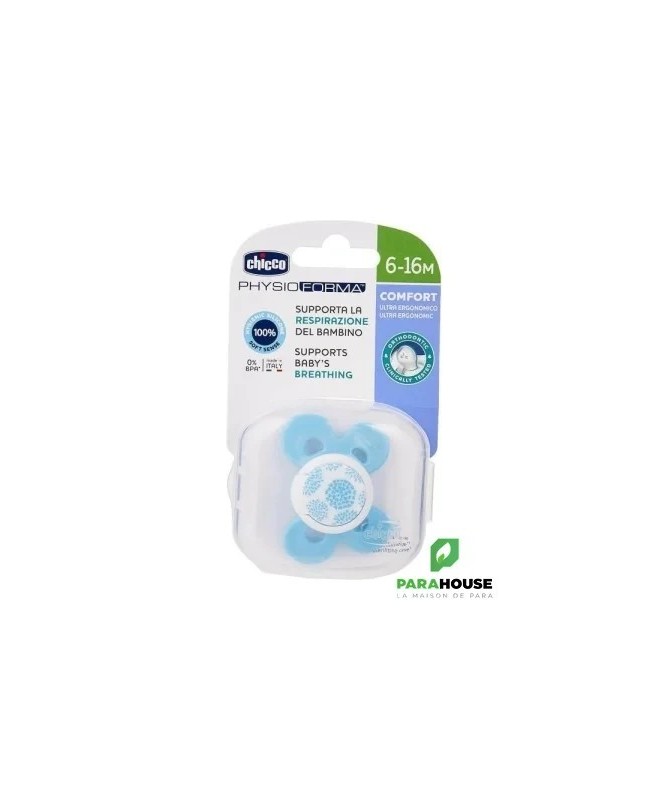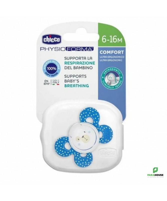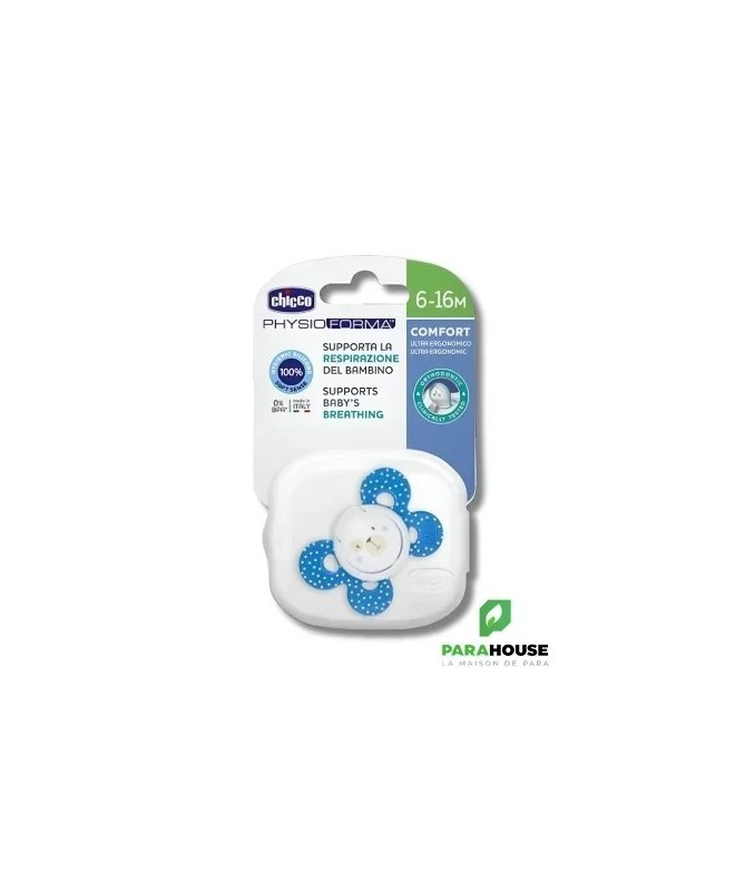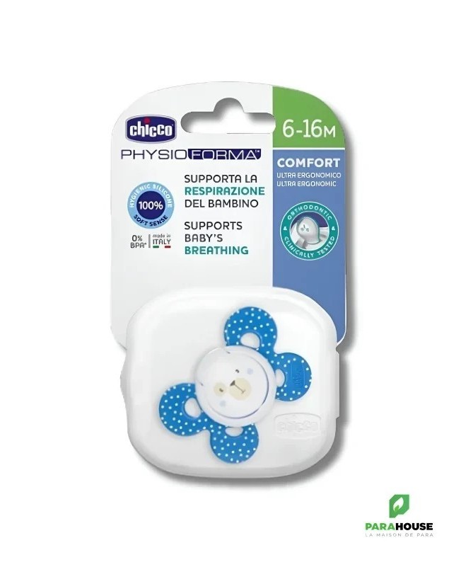 Chicco Sucette Physio Comfort - Silicone 6-16M Les sucettes Chicco PhysioForma Comfort assurent un confort optimal à votre enfant ! Elles favorisent le bon développement de la bouche de bébé et favorisent sa respiration physiologique. Spécialement conçues pour les bébés de 6 à 16 mois. La sucette Chicco PhysioForma Comfort est fabriquée en silicone, un matériau choisi pour sa praticité, son hygiène et son indéformabilité. Sa finition exclusive SOFT SENSE lui confère douceur et velouté. Caractéristiques : Forme extra ergonomique : les sucettes Chicco laissent un grand espace pour le nez et le menton de bébé, ce qui facilite les mouvements et la respiration de bébé. Soutient la respiration de bébé : PhysioForma est la forme exclusive de Chicco qui soutient la respiration physiologique de bébé en maintenant la langue dans sa position naturelle et crée ainsi des voies respiratoires ouvertes pour que bébé respire correctement. Conçues en collaboration entre des pédiatres, des orthodontistes et l'Osservatorio Chicco, les sucettes pour bébé PhysioForma sont constamment testées et approuvées. Elles favorisent activement le bon développement de la bouche de bébé et aident à soutenir sa respiration. Elles sont fabriquées en silicone, un matériau hygiénique et déformable. Délicate sur le visage de bébé : la sucette confort n'a que 4 points de contact pour assurer une extrême douceur sur le visage de bébé. Vaste espace à la base de la tétine : la tétine est positionnée pour faciliter la succion confortable de bébé en laissant la zone appropriée pour assurer le bon mouvement des lèvres de bébé. La rainure et la forme angulaire de ces sucettes favorisent une répartition uniforme de la pression de la langue, favorisant ainsi le bon développement du palais dans la bouche de bébé. ● Le plastique est très nocif pour la santé de bébé. C'est pourquoi les sucettes Chicco sont fabriquées en silicone 100 % sans BPA pour garantir la sécurité.