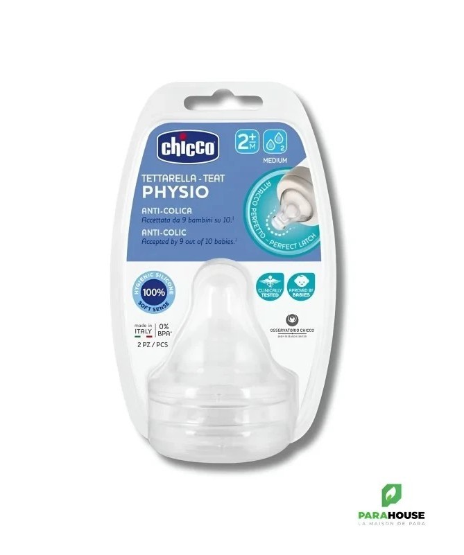 Chicco - Lot de 2 Tétines Physiologiques Silicone (+2 mois)Ce lot comprend deuxtétines physiologiques en silicone, conçues pour offrir un confort optimal et une tétée naturelle dès 2 mois.Caractéristiques- Débit moyen: idéal pour les bébés à partir de 2 mois.- Valve anti-hoquet: garantit un flux d'air régulier, réduisant les coliques, régurgitations et le hoquet.- Silicone de haute qualité: plus souple et doux pour une succion naturelle.- Base large: imite la forme du sein maternel pour une transition facilitée entre allaitement et biberon.