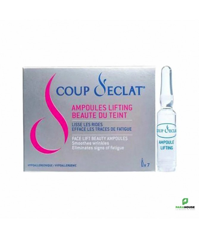 COUP D’ECLAT Ampoules Lifting Beauté du Teint - 3 AMPOULES COUP D’ECLAT Ampoules Lifting Beauté du Teint: Pour un Teint terne, traits fatigués, nuit trop courte, rides d’expression, ridules. COUP D’ECLAT Ampoules Lifting Beauté du Teint: Véritable soin SOS. Rehausse instantanément l’apparence du visage. Corrige l’apparence des rides et ridules, illumine le teint. Efface les traces de fatigue et les petits excès de la veille. Aide à la tenue du maquillage. La peau est lumineuse et paraît fraîche et reposée. Effet durable 8 heures. Convient aux peaux sensibles. Teint terne, traits fatigués, nuit trop courte, rides d’expression, ridules. Mise en beauté le matin pour réveiller l’éclat du visage, et le soir comme mise en beauté express pour une soirée, une fête, ou toute occasion spéciale. Format: 3 x 1 ml Composition: Acmella Oleracea, Bio polymères de protéines d’amande à haut poids moléculaire, Provitamine B5 Formule hypoallergénique: sans paraben, sans protéines de blé. Conseil d'utilisation: Il est indiqué d'appliquer le matin avant tout autre soin pour effacer les traces de fatigue et réveiller l’éclat du visage et, le soir, comme mise en beauté immédiate avant une soirée, une fête ou toute occasion spéciale.