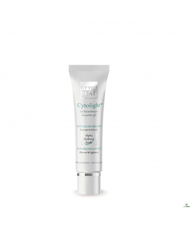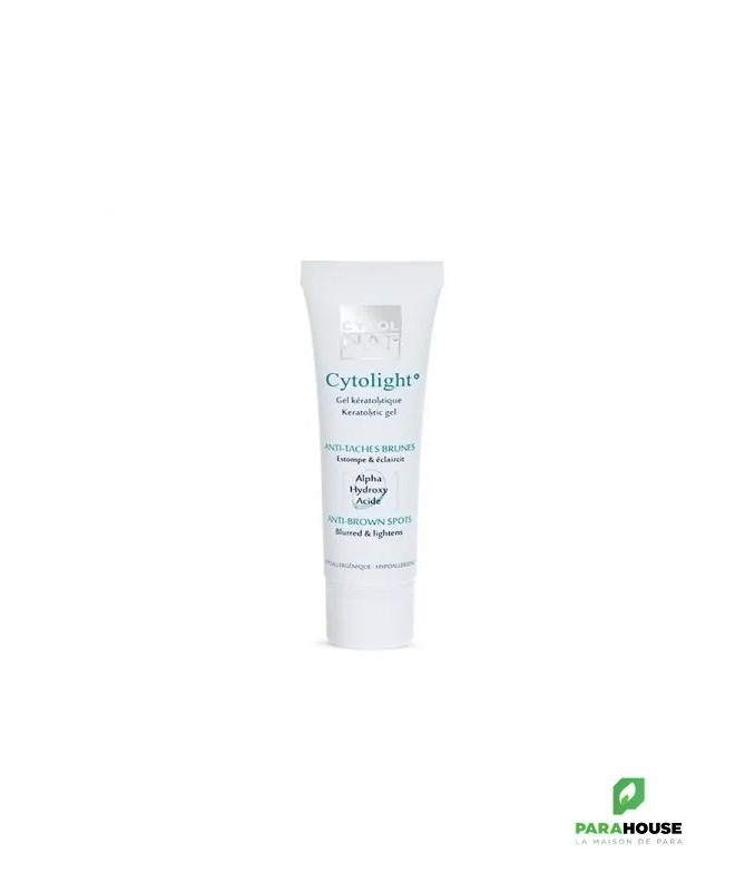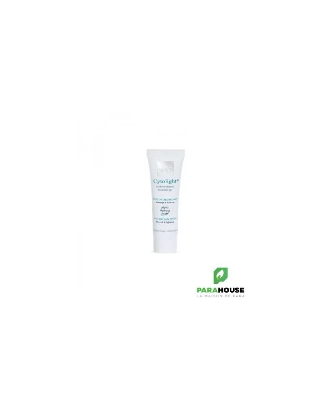 Cytolight gel est un soin de nuit kératolytique concentré pour la préparation des peaux hyperpigmentées aux soins éclaircissants des tâches pigmentaires du visage, du décolleté et des mains. Cytolight gel associe : Un Alpha hydroxyacide (AHA) naturel, assurant un peeling doux atténuant ainsi la couleur des taches brunes dès les premiers jours d’utilisation à un complexe éclaircissant breveté (Achillée millefeuille, Prunellier pourpre, Robinier faux acacia) permettant d’estomper les taches brunes et unifier le teint de la peau. • Masque de grossesse (chloasma résiduel). • Taches solaires. • Taches dues au vieillissement (lentigos séniles). • Tache de photosensibilisation (médicament, parfum). • Marques d’imperfection. • Assurer un peeling doux qui favorise une meilleure pénétration des actifs augmentant ainsi leur efficacité. • Gommer en douceur les cellules mortes et éliminer les pigments accumulés en surface. • Réduire visiblement la taille des taches pigmentaires. • Purifier et affiner le grain de la peau. • Unifier et sublimer le teint.