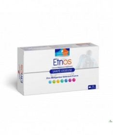 Etnos est un complément alimentaire à base de calcium, magnésium, zinc et vitamine D3.Cette parfaite combinaison présente des propriétés synergiques uniques qui permet demaintenir une bonne ossature et une dentition solide.Calcium :Le calcium est le minéral le plus abondant dans l’organisme, et est le mieux connu pour sonrôle essentiel dans la minéralisation des os et des dents.Magnésium :Le magnésium renforce la structure des os et des dents, et permet le bon fonctionnement musculaire et nerveux.Zinc :Aide au processus d’anti-oxydation.Vitamine D3 :Contribue à l’absorption du calcium au niveau de l’intestin et facilite sa fixation sur les os.Manganèse :Contribue à protéger les cellules contre le stress oxydatif.Sélénium :Soutient la santé osseuse en protégeant les cellules contre le stress oxydatif.Boite : 30 comprimés