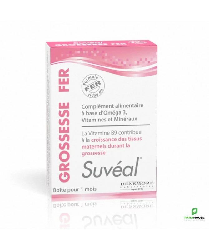 SUVEAL GROSSESSE FER 30 CAPSULES 1 MOIS C'est un complément alimentaire à base d'Omega 3, Vitamines et Minéraux. Il est constitué de la Vitamine B9 qui contribue à la croissance des tissus maternels durant la période de grossesses. La Vitamine B9 contribue à la croissance des tissus maternels durant la grossesse. Le Zinc et les vitamines (B9, B12, D) jouent un rôle dans le processus de division cellulaire. Le Zinc contribue à la synthèse normale de l’ADN. Les vitamines (B2, B3, B5, B6, B9, B12, C) contribuent à réduire la fatigue. Les Oméga 3 (DHA) contribuent au fonctionnement normal du cerveau ; l’effet bénéfique est obtenu par la consommation journalière de 250 mg de DHA Composition: Ingrédients: Huile de possion riche en DHA, huile de colza, humectant: fumarate de fer, glycérol, tunique: gélatine de poisson, acide ascorbique (Vitamine C), Epaississant: nicotinamide (Vitamine B3), acétate de d'alpha tocophérol (Vitamine E naturelle), cire d'abeille, sulfate de zinc microencapsulé, panthothénate de calcium (Vitamine B5), colorants: mononitrate de thiamine (Vitamine B1), oxyde de fer, acide folique (Vitamine B9), bleu parenté, chlorure de chrome, cholécalciférol (Vitamine D3), iodure de potassium, sélénite de sodium, émulsifiant: cyanocobalamine (Vitamine B12) sur maltodextrine, léchitine de colza, chlorydrate de pyridoxine (Vitamine B6), riboflavine Vitamine B2). NB : Sans gélatine bovine. Conseils d'utilisation: Il est indiqué de prendre 1 capsule de SUVEAL GROSSESSE FER par jour à avaler au cours d'un repas, tout au long de la période de grossesse. Il est recommandé de ne pas dépasser la dose journalière. NB:Un compléments alimentaires doit être utilisé dans le cadre d'un mode de vie sain. Il faut tenir hors de la portée des jeunes enfants. Il est indiqué de le conserver à une température ambiante.