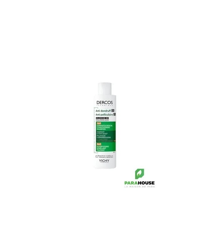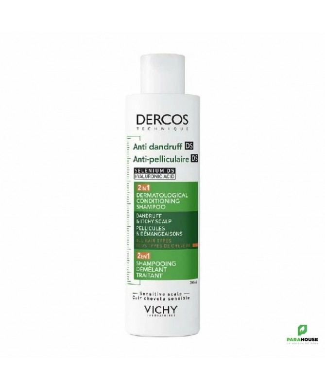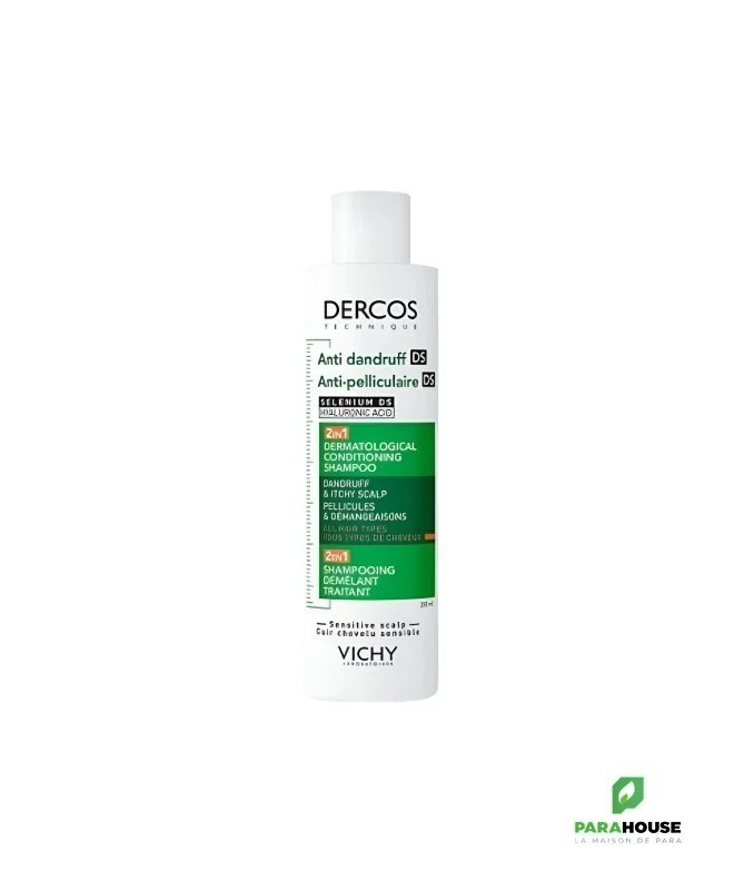 Shampooing Démêlant 2 en 1 DS DERCOSLe shampooing démêlant 2 en 1 DS DERCOS élimine efficacement 100 % des pellicules visibles dès la première application. Sa formule enrichie en acide hyaluronique prend soin de vos cheveux tout en leur offrant jusqu’à 72 heures d’hydratation. Ce shampooing anti pelliculaire agit également contre la réapparition des pellicules pendant 6 semaines, tout en rééquilibrant le microbiome du cuir chevelu pour une efficacité longue durée.Bénéfices :- Élimination de 100 % des pellicules visibles dès la première utilisation*.- Action anti récidive pendant 6 semaines.- Hydratation durable de 72 heures, avec des cheveux plus doux et plus brillants.- Formule enrichie qui prend soin des cheveux tout en luttant contre les pellicules.Ingrédients Actifs :La formule du shampooing anti pelliculaire DERCOS démêlant 2 en 1 DS est enrichie avec duDisulfure de Séléniumpour éliminer les pellicules, et de l'Acide Hyaluroniquepour hydrater et nourrir la fibre capillaire.Conseils d'Utilisation :- Agitez le shampooing avant utilisation.- Appliquez sur cheveux humides, massez, puis laissez agir pendant 2 minutes avant de rincer.- Utilisez en cure pendant 4 semaines, à raison de 3 fois par semaine.- Évitez tout contact avec les yeux en raison de la présence de Disulfure de Sélénium. En cas de contact, rincez abondamment.Composition :AQUA / WATER / EAU, Sodium Laureth Sulfate, Dimethicone, Glycol Distearate, Coco-Betaine, Glycerin, PPG-5-Ceteth-20, Selenium Sulfide, Carbomer, CI 47005 / Acid Yellow 3, Citric Acid, Menthol, 2-Oleamido-1,3-Octadecanediol, Salicylic Acid, Sodium Benzoate, Sodium Chloride, Sodium Hyaluronate, Sodium Hydroxide, Tocopheryl Acetate, Parfum / Fragrance.