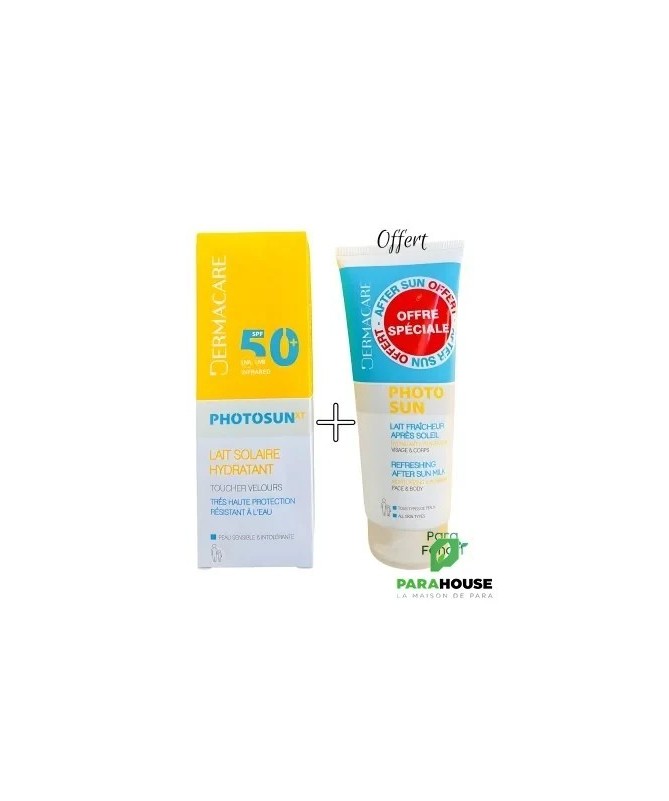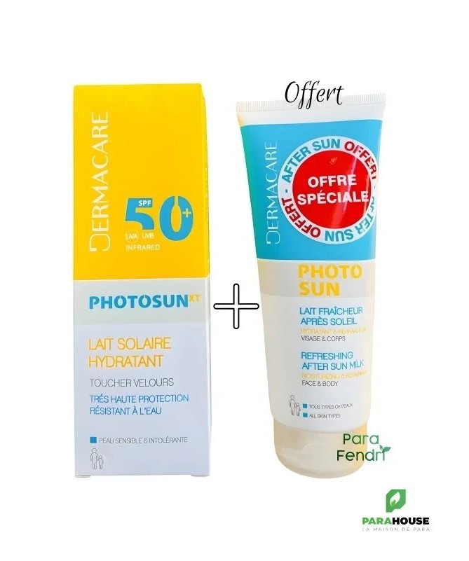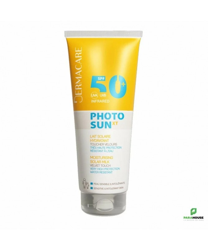 DERMACARE PHOTOSUN XT LAIT SOLAIRE TOUCHER VELOURS SPF50 +200ML DERMACARE PHOTOSUN XT LAIT SOLAIRE HYDRATANT SPF50+ est un lait hydratant pour les Peaux sensibles Visage et corps, Résistant à l’eau avec une Protection cellulaire profonde L'ecran Photosun offre une protection cellulaire profonde à la peau contre le soleil. DERMACARE PHOTOSUN XT LAIT s’utilise sur le visage et le corps des adultes et des enfants, pour tous types de peaux dont peaux sensibles Conseils d’utilisation : Il est recommandé d'Appliquer DERMACARE PHOTOSUN XT LAIT juste avant l’exposition, renouvelez généreusement et fréquemment surtout après avoir nagé, vous être essuyé ou avoir transpiré.
