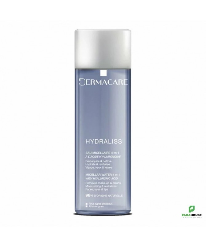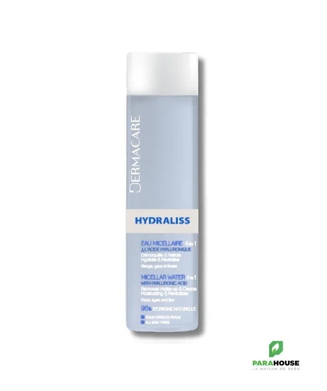 Le Dermacare Hydraliss Eau Micellaire 4 en 1 est adaptée à tous types de peaux, y compris sensibles et sèches. Sa formule associe agents nettoyants doux et actifs hydratants pour une peau propre, douce et apaisée. Enrichie en eau thermale, elle possède des propriétés anti-irritantes et anti-pollution, aidant à réduire rougeurs et inconfort tout en protégeant le film hydrolipidique de la peau.Bénéfices :Nettoyage en profondeur :Élimine impuretés, sébum et maquillage, même waterproof, sans agresser la peau.Hydratation optimale :Glycérine et aloe vera maintiennent l'hydratation naturelle, laissant la peau douce et souple.Apaisement des irritations :Extraits de calendula et hamamélis réduisent rougeurs et tiraillements.Facilité d’utilisation :Flacon-pompe pratique pour un démaquillage rapide matin et soir.Propriétés anti-âge :L'acide hyaluronique aide à lisser les ridules et à maintenir la fermeté de la peau.Indications :Convient à tous types de peaux : sèche, sensible, normale ou mixte.Démaquillage doux : idéal pour les yeux et contour délicat des paupières.Peaux sujettes aux irritations : apporte confort immédiat aux peaux intolérantes ou réactives.Routine beauté quotidienne : pour un nettoyage complet et un effet frais toute la journée.Conseils d’utilisation :Imbibez un coton d’eau micellaire.Nettoyez délicatement visage et cou avec des mouvements circulaires.Démaquillez le contour des yeux en laissant agir quelques secondes avant d’essuyer doucement.Pas besoin de rincer, poursuivez votre routine avec crème ou sérum.Utilisation matin et soir pour maintenir la peau propre et hydratée.