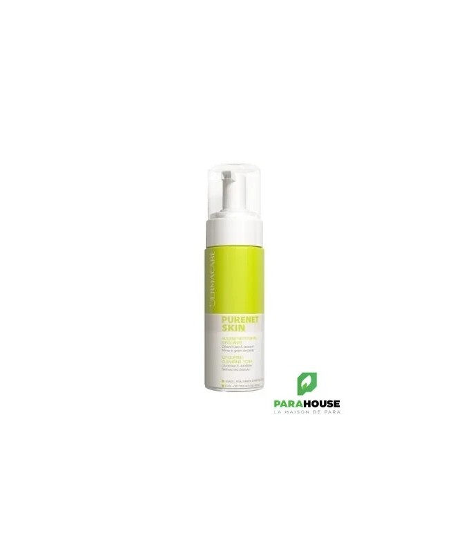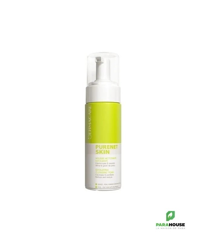 DERMACARE PURENET SKIN MOUSSE NETTOYANTE EXFOLIANTE 150ML Idéal pour les peaux grasses à imperfections. Fraiche et fondante, DERMACARE PURENET SKIN MOUSSE NETTOYANTE EXFOLIANTE DERMACARE PURENET SKIN MOUSSE NETTOYANTE nettoie sans dessécher la peau, purifie, libère la peau des impuretés. Le grain de peau s'améliore, la peau est purifiée et lissée. La peau retrouve son éclat. La mousse PURENET SKIN nettoie et gomme la peau en douceur et oOffre une micro-exfoliation progressive de la peau pour désincruster les pores, lisser le grain de peau et révéler un teint éclatant et uniforme. Les actifs de fruits (AHA) préviennent l’apparition des boutons et permettent d’éliminer les comédons et points noirs pour retrouver une peau nette et saine. Composition : AHA - ZINC PCA - PENTAVITTIN Conseil d'utilisation : Le nettoyant peut être utilisé le matin et le soir après un démaquillant. Appliquer sur la peau préalablement humidifiée Nettoyez délicatement en effectuant des mouvements circulaires. Rincer abondamment à l’eau claire, puis sécher à l’aide d’une serviette propre. Matin et/ou soir, déposer 2 pressions de mousse au creux de la main. Il est ensuite conseillé d’appliquer la crème matifiante séborégulatrice sur une peau parfaitement sèche. Lorsque la peau est très sensible, il est préconisé d’utiliser la mousse nettoyante exfoliante un jour sur deux, en complément du gel nettoyant assainissant Purenet Skin.