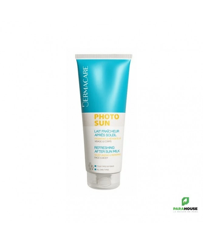 Dermacare Photosun le Lait fraicheur est soin à la fois après-soleil réparateur pour le visage et lait hydratant pour le corps il intervient après l'exposition en complément des produits solairesPhotosun ce lait après-solaire procure une sensation immédiate de fraîcheur et de confort aux peaux asséchées par l'action du soleilIl laisse une peau satinée, hydratée et délicatement parfumée grâce à ses notes de vanille, d'orange douce et de fleurs de tiaréIl aide à prolonger le bronzage jusqu'à deux semaines après l'exposition.