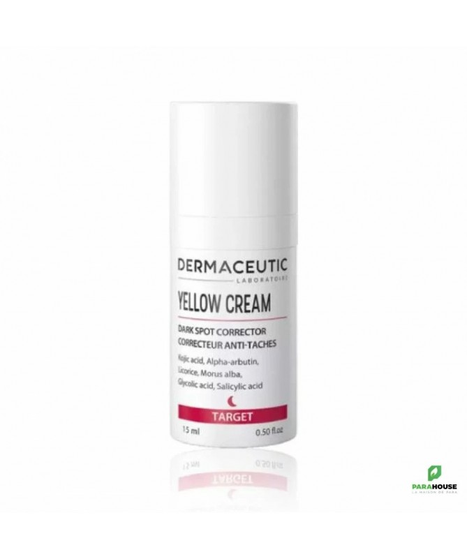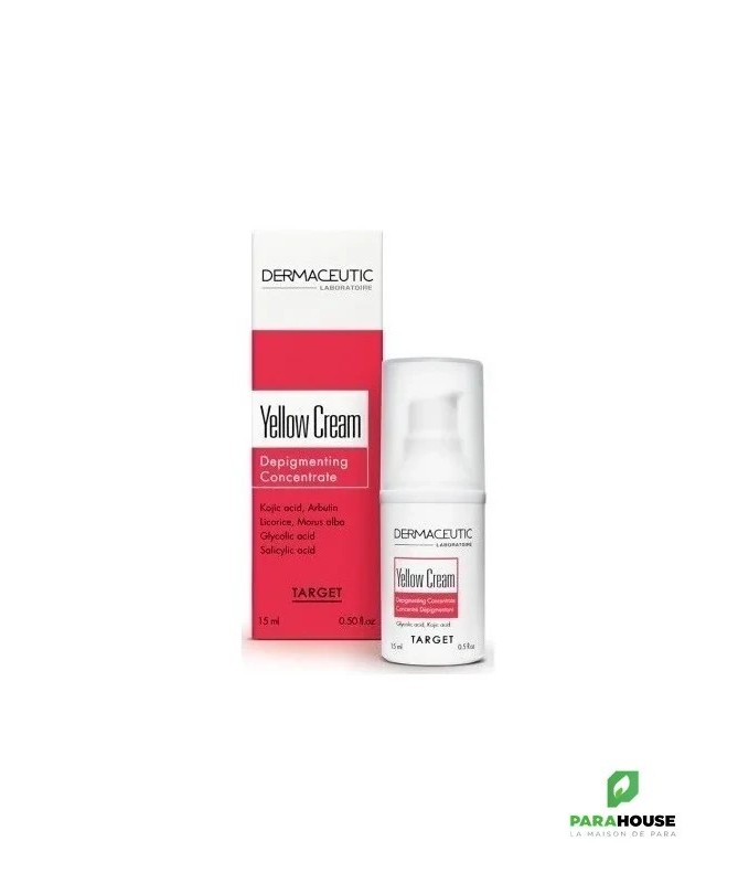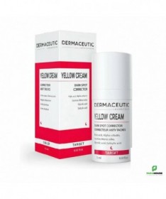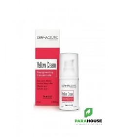 DERMACEUTIC YELLOW CREAM CORRECTEUR ANTI TACHES 15ML Concentré dépigmentant. DERMACEUTIC Yellow cream est un concentré dépigmentant à recommander lors de traitements contre les hyperpigmentations, rebond pigmentaires post laser ou peeling, melasma ou taches hormonales. Elle traite efficacement les imperfections cutanées et le teint irrégulier, laissant votre peau uniforme. Cible et réduit les taches pigmentaires Améliore les imperfections de la peau Unifie le teint Composition: Water (Aqua), Butylene Glycol, Glycolic Acid, Cetearyl Alcohol, Glyceryl Stearate, Ceteareth-20, Cetyl Palmitate, Arctostaphylos Uva Ursi Leaf Extract, Propylene Glycol, Glycine Soja (Soybean) Oil, Undecylenoyl Phenylalanine, Kojic Acid, Maltodextrin, Triethanolamine, Pentylene Glycol, Alpha-Arbutin, Hydroxyethyl Acrylate/Sodium Acryloyldimethyl Taurate Copolymer, Magnesium Aluminum Silicate, Prunus Amygdalus Dulcis (Sweet Almond) Oil, Prunus Armeniaca (Apricot) Kernel Oil, Salicylic Acid, Simmondsia Chinensis (Jojoba) Seed Oil, Tocopheryl Acetate, Triticum Vulgare(Wheat) Germ Oil, Morus Alba Bark Extract, Morus Alba Root Extract, Xanthan Gum, Sodium Metabisulfite, Undecylenic Acid, Tetrasodium EDTA, Glycyrrhiza Glabra (Licorice) Root Extract, Polysorbate 60, Scutellaria Baicalensis Root Extract, Sorbitan Isostearate, Sodium Hydroxide, Yellow 5 (CI 19140). NB : Sans parfum. Sans silicone. Conseils d'utilisation: Appliquer yellow cream dermaceutic le soir sur les taches pigmentaires. Éviter le contour des yeux.