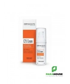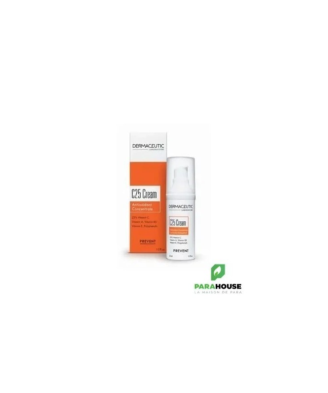 DERMACEUTIC C25 CREAM CONCENTRE ANTIOXYDANT 30ML Soin de jour. Antioxydant. Contient de la vitamine C 25%, A, B, E et des polyphénols. Ce soin de jour véritable protecteur du vieillissement cutané dû aux agressions extérieures : il lutte contre la perte de tonicité et d'élasticité et régule le teint. Ce sérum contient une formulation révelutionnaire d'antioxydants permettant une lutte efficace contre les radicaux libres et assurant la résistance aux rayons du soleil et à la pollution. Les facteurs déclecheurs des rides et des taches sont ainsi maitrisés et limités. Le methylsilanol ascorbate (dérivé stable de la vitamine C), protège les fibres de collagène et maintient l'hydratation de la peau.
