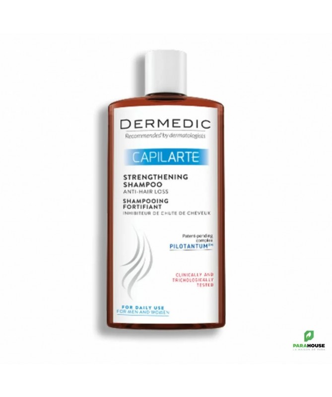 DERMEDIC CAPILARTE Shampooing Fortifiant Anti Chute - Cheveux Fins DERMEDIC CAPILARTE Shampooing Fortifiant est un soin capillaire qui permet de nettoyer les cheveux fragiles en stimulant leur croissance. Il Améliore la microcirculation dans le follicule et l'apport sanguin vers les cellules souches en assurant une bonne nutrition qui favorise le bon développement et renforcement du cheveu. DERMEDIC Shampooing Anti Chute permet de prolonger le cycle de vie des cheveux, de réduire la perte excessive et d'augmenter leur volume et leur densité. DERMEDIC Shampooing Anti Chute qui prévient la chute de cheveux de diverses étiologies, est recommandé en usage quotidien continu pour les personnes ayant des cheveux fins, fragiles ou sujets à la chute, ainsi que pour celles présentant une perte de cheveux temporaire ou une perte de cheveux d'origine non génétique. Composition : Ingrédients : PilotantumTM complex, ProcapilTM, cluster bean extract, Zincidone, d-panthenol, vitamins E, C and PP, Lactilglutammato, glycerol Conseils d'utilisation : Il est recommandé d'appliquer DERMEDIC CAPILARTE Shampooing Fortifiant sur cheveux humides. Massez délicatement et soigneusement votre cuir chevelu pour éliminer toutes les impuretés et dégager l'accès aux follicules pileux. Laissez agir au moins 2 minutes. Rincez abondamment. Pour cuir chevelu sensible, cheveux fins et clairsemés, avec tendance à la chute. Recommandé en complément du traitement stimulant la croissance capillaire CAPILARTE.