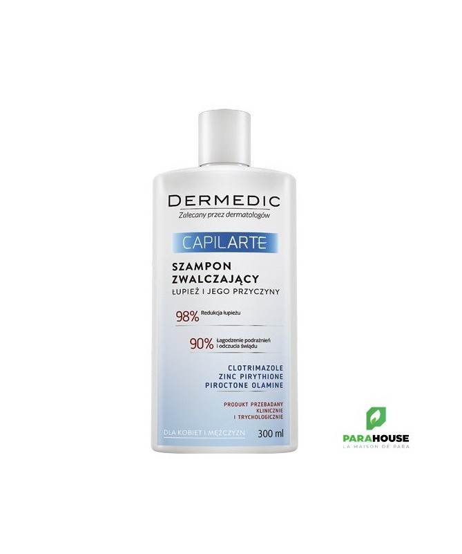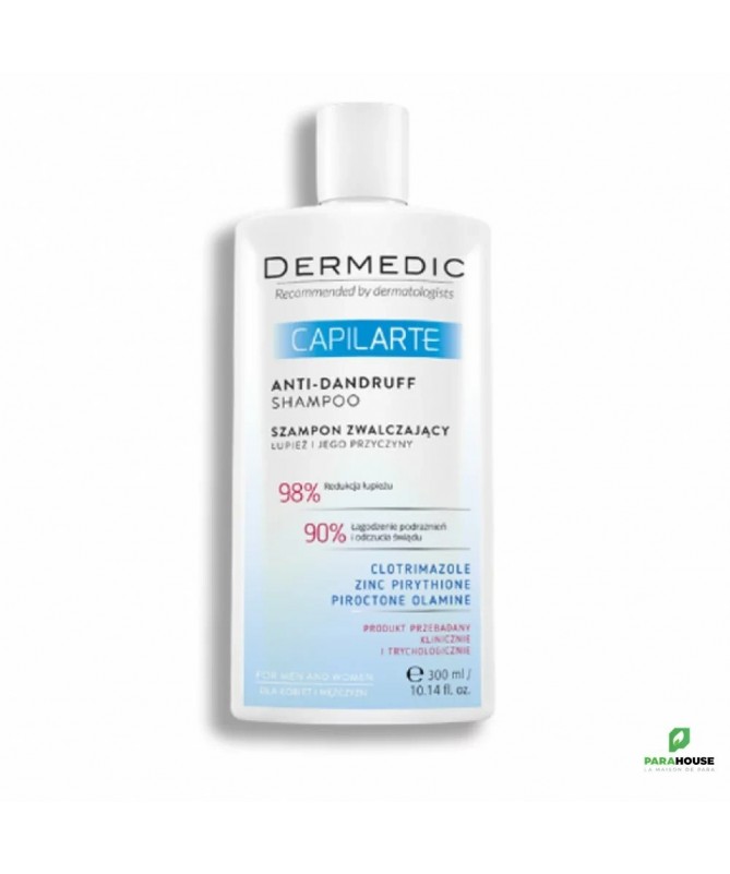 DERMEDIC CAPILARTE Shampooing Anti Pelliculaire 300 ML DERMEDIC CAPILARTE Shampooing Anti Pelliculaire permet de traiter les états pelliculaires de diverses étiologies, y compris les pellicules sèches et grasses et empêche leur réapparition. Il possède une action antifongique qui permet de limiter traiter la cause des pellicules et des démangeaisons. DERMEDIC Shampooing Anti Pelliculaire intervient au niveau du processus de renouvellement cellulaire de la peau et permet d'éviter la prolifération des micro-organismes et de réguler l'activité des glandes sébacées. Il permet ainsi de se débarrasser des pellicules et d'apaiser les irritations et démangeaisons. Composition : Ingrédients: Clotrimazole, Zinc pyrithione, Olamine pyrithione, Lactitol, Glycérine, D-Panthénol Conseils d'utilisation : Il est conseillé d'appliquer DERMEDIC CAPILARTE Shampooing Anti pelliculaire sur cheveux mouillés. Laisser agir 3 minutes, puis rincer abondamment. En cas de contact avec les yeux, rincer abondamment à l'eau. Utiliser le shampoing pendant 4 semaines, 2 à 3 fois par semaine. En prophylaxie, utiliser 1 à 2 fois par semaine. Recommandé pour les cuirs chevelus sensibles et les personnes souffrant de pellicules d'origines diverses, sèches ou grasses. Convient également aux personnes souffrant de dermatite séborrhéique, d'eczéma et de psoriasis.