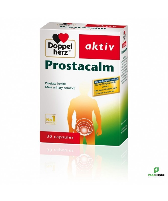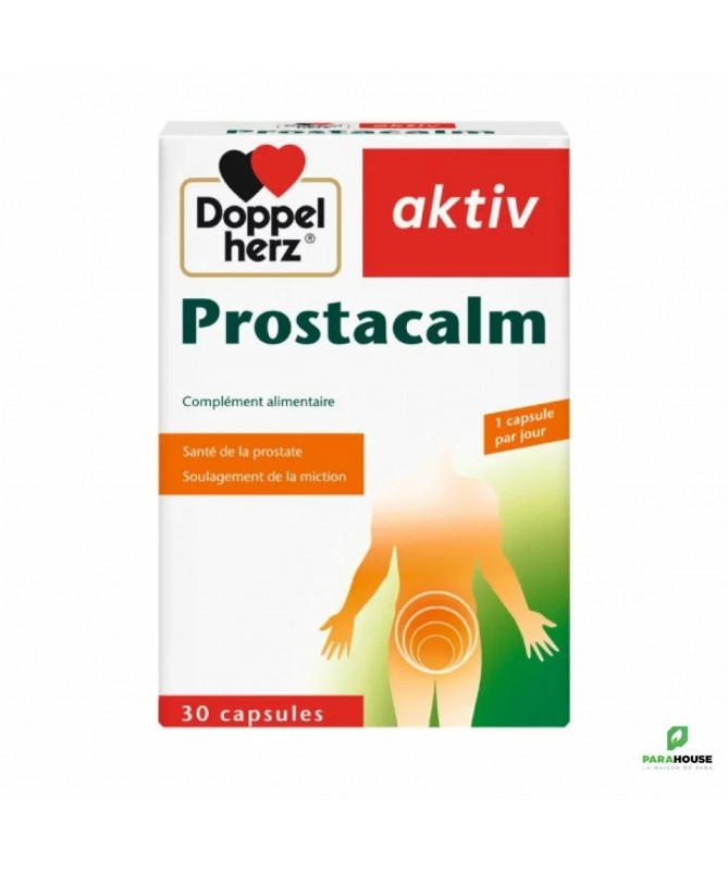 AKTIV Prostacalm 30 GELULES Aktiv Prostacalm de Doppelhertz est une combinaison d'extraits de plantes et d'antioxydant qui permet de : Soulager les symptômes liés à l'hypertrophie bénigne de la prostate Maintenir la prostate en bonne santé Mieux vider la vessie Lutter contre les inflammations Soulager la miction Les graines de courge sont riches en acides gras essentiels et en phytostérols qui ont une action positive sur le fonctionnement de la prostate. Les feuilles d‘ortie permettent de soulager la miction en présence d‘une hypertrophie bénigne de la prostate grâce aux stérols qu’elles contiennent. L‘huile de lin est concentrée en acide α-linolénique, un acide gras oméga-3 reconnu pour son implication dans l‘atténuation des processus inflammatoires entrant en jeu dans certaines affections de la prostate. La vitamine E est un antioxydant liposoluble qui se loge dans les membranes cellulaires pour y exercer son action anti-radicalaire. Le zinc participe, en tant que cofacteur, à l‘activité de plus de 200 enzymes et possède également une activité antioxydante particulière en empêchant l‘oxydation des protéines contenant des résidus soufrés. Le manganèse et le sélénium sont requis pour l‘activité de certaines enzymes constituant la première ligne de défense face au stress oxydatif et aux radicaux libres qui abîment les cellules. Composition : huile de graines de courge, huile de lin, gélatine (bovine), extrait sec de feuilles d’ortie, glycérine (humectant), sorbitol (humectant), monostéarate de glycérol (émulsifiant), lécithine (émulsifiant), vitamine E, cire d’abeilles (antiagglomérant), oxyde de zinc, oxydes de fer (colorant), sulfate de manganèse monohydrate, sélénate de sodium NB : Formule sans gluten ni lactose Conseils d'utilisation: Prendre 1 à 2 comprimés par jour après le repas avec un grand verre d’eau. Ne pas croquer les comprimés. À prendre en cure de 3 mois renouvelable. Ne pas dépasser la posologie recommandée. Les compléments alimentaires ne peuvent pas se substituer à une alimentation équilibrée et variée. Tenir hors de la portée des enfants. A conserver à une température inférieure à 25 °C.