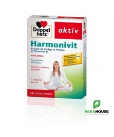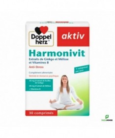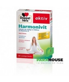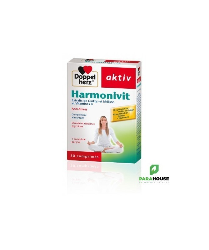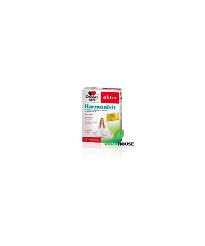 AKTIV Harmonivit 30 GELULES Aktiv Harmonivit à une formule à base de plante, Anti-Stress ! Harmonivit Aktiv de Doppelhertz est une combinaison d‘extraits de ginkgo, de mélisse et de vitamines B qui aide à mieux surmonter le stress de la vie quotidienne. Grâce à sa formule à base de plante, Aktiv Harmonivit soulage l'anxiété et réduit les troubles du sommeil : Le ginkgo a des propriétés stimulantes, favorise la concentration et la conservation d’un esprit alerte. La mélisse quant à elle soulage l’anxiété, l’agitation et les troubles du sommeil. Les vitamines du groupe B jouent ensemble un rôle central dans la marche du métabolisme énergétique et contribuent ainsi au bon fonctionnement du système nerveux. De plus, l'acide pantothénique permet une meilleure endurance intellectuelle. Les vitamines B6, B12 et l’acide folique, en contribuant à la diminution du taux sanguin d’homocystéine, agissent de manière favorable sur le système vasculaire. Doppelherz aktiv Harmonivit est conseillé aux personnes qui ressentent quotidiennement les effets du stress dans la vie professionnelle ou privée, pendant les études, ou toutes les situations qui sont nerveusement épuisantes. Composition : Phosphate dicalcique (agent de charge), cellulose microcristalline (agent de charge), extrait de feuilles de Ginkgo (Ginkgo biloba), extrait de feuilles de Mélisse (Melissa officinalis), nicotinamide, dioxyde de silice (antiagglomérant), D-pantothénate de calcium, carboxyméthylcellulose de sodium réticulée (agent de charge), hydroxypropylméthyl- cellulose (agent d’enrobage), sels de magnésium d’acides gras (antiagglomérant), poudre de cellulose (agent d’enrobage), hydroxycarbonate de magnésium (antiagglomérant), carbonate de calcium (colorant), chlorhydrate de pyridoxine (vitamine B6), talc (antiagglomérant), hydroxypropylcellulose (agent de charge), polyéthylène glycol (agent d’enrobage), riboflavine (vitamine B2), mononitrate de thiamine (vitamine B1), oxydes et hydroxydes de fer (colorant), acide ptéroylmonoglutamique (acide folique), D-biotine, cyanocobalamine (vitamine B12). NB : Sans lactose ni gluten Conseils d'utilisation: Il est indiqué de prendre 1 comprimé de AKTIV Harmonivit par jour Ne pas croquer le comprimé. Ne pas dépasser la posologie recommandée. Les compléments alimentaires ne peuvent se substituer à une alimentation équilibrée et variée. Tenir hors de la portée des enfants. A conserver à une température inférieure à 25 °C.