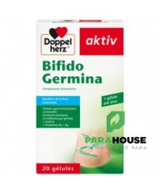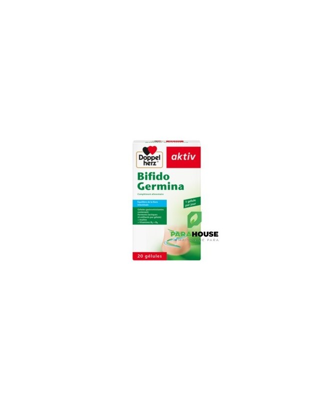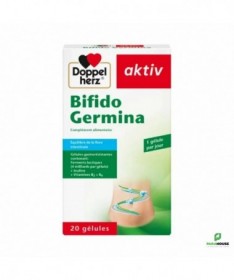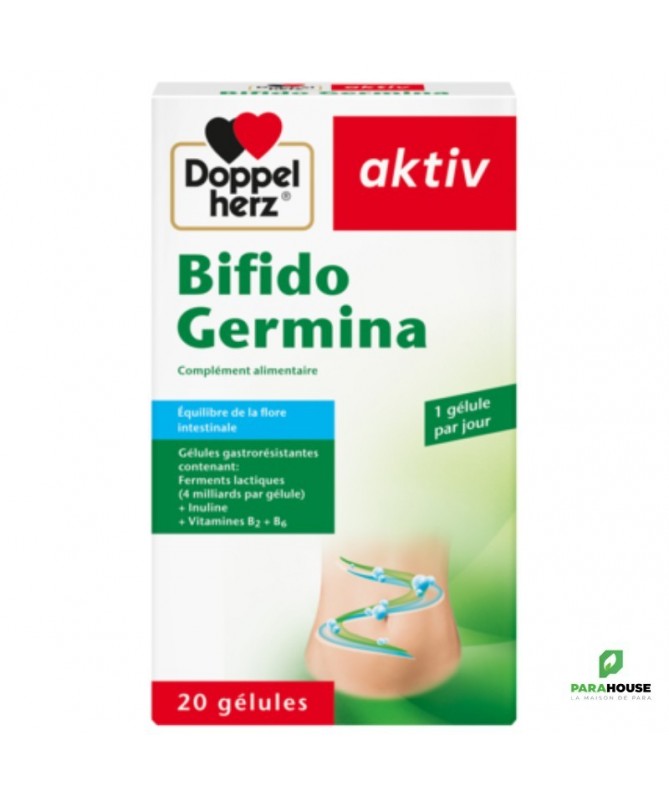 Description :Bifido Germina contient 4 milliards de cellules issues de 5 souches de bactéries probiotiques, de l’inuline ainsi que de la vitamine B2 et de la vitamine B6Notre flore intestinale est une association complexe et dynamique de bactéries symbiotiques qui ont un impact considérable sur la santé du système digestif, sur la régulation du métabolisme et sur la fonction immunitaire.Une flore intestinale saine et variée contribue à une digestion normale et sert de rempart à la prolifération d’autres bactéries, pathogènes, qui peuvent être à l’origine de troubles digestifs.Les gélules Doppelherz Bifido Germina contiennent deux souches de Bifidobactéries et trois souches de Lactobacilles probiotiques qui ont été spécialement choisies pour : aider à régénérer une flore intestinale saine, notamment après la prise d’antibiotiques, soutenir un transit intestinal normal en cas d’irrégularités (constipation ou diarrhée), améliorer certains symptômes associés au côlon irritable.Bifidobacterium animalis ssp. Lactis Bi1Lactobacillus acidophilus LA1Bifidobacterium breve Bbr8Lactobacillus plantarum 14DLactobacillus rhamnosus SP1Ces souches sont protégées des sucs gastriques par une gélule à enrobage entérique et parviennent donc intactes dans l’intestin où elles peuvent exercer leur action bénéfique. Cette action est renforcée par la présence d’inuline, une fibre non digestible prébiotique qui stimule leur développement et facilite leur implantation dans l’intestin.Les gélules Bifido Germina de Doppelherz contiennent également de la vitamine B2 qui aide à maintenir un épithélium intestinal normal ainsi que de la vitamine B6 qui soutient la fonction normale du système immunitaire.La vitamine B2 contribue au maintien de muqueuses normales, telles que la muqueuse intestinale.La vitamine B6 contribue à une fonction normale du système immunitaire.Avec une surface d'environ 400 m², l'intestin est le plus grand organe du corps humain. La flore intestinale est composée de plusieurs milliards de microorganismes. Le tractus gastro-intestinal présente une muqueuse avec une très grande surface, nécessaire par exemple à l'absorption des nutriments.Conseils d’utilisation :Prendre 1 gélule par jour au repas avec suffisamment de liquide sans mâcher.Ce produit convient aux enfants de plus de 12 ans et aux adultes, en revanche il est déconseillé chez la femme enceinte ou allaitante.Remarques :Ne pas dépasser la posologie recommandée. Les compléments alimentaires ne peuvent pas se substituer à une alimentation équilibrée et variée. Tenir hors de la portée des enfants.A conserver à une température inférieure à 25 °C.Composition :Amidon de maïs, inuline, hydroxypropylméthylcellulose (agent d’enrobage), Bifidobacterium animalis ssp. lactis Bi1 (LMG P-17502), Lactobacillus acidophilus LA1 (LMG P-21904), Bifidobacterium breve Bbr8 (LMG P-17501), sels de magnésium d'acides gras (antiagglomérant), Lactobacillus plantarum 14D (CECT 4528), gomme gellane (agent d'enrobage), Lactobacillus rhamnosus SP1 (DSM 21690), chlorhydrate de pyridoxine (vitamine B6) et riboflavine (vitamine B2).