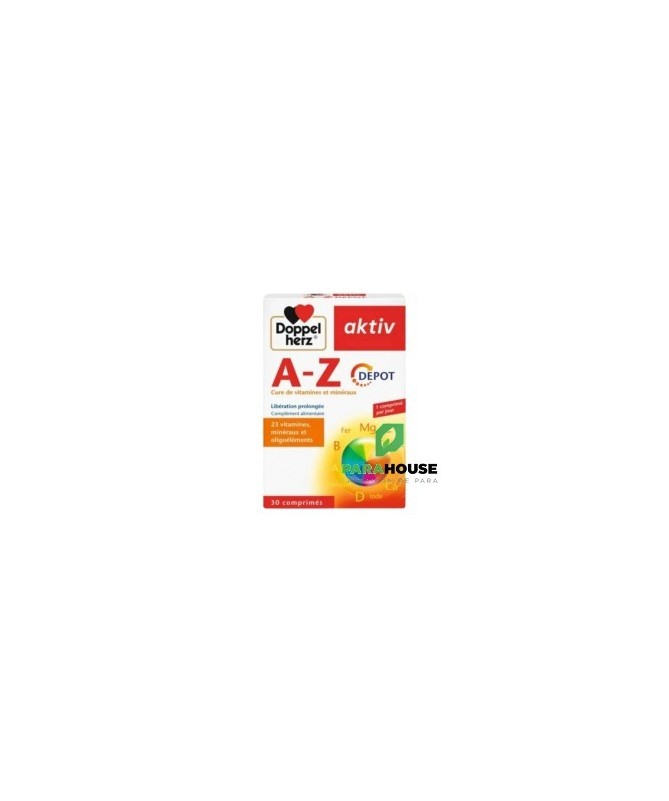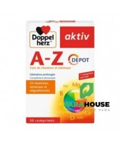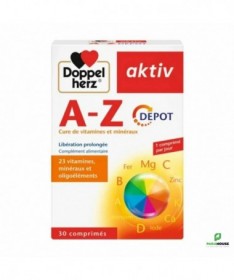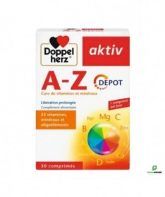 AKTIV A-Z 30 COMPRIMES AKTIV AZ est un complément alimentaire: 23 vitamines, minéraux et oligoéléments. Il est à base d'une sélection de nutriments, comme la vitamine C, la vitamine E ainsi que certaines vitamines du groupe B, sont spécialement adaptés à ces besoins nutritionnels de l'organisme. Les réserves de l'organisme en certaines vitamines et certains minéraux sont limitées. Ainsi, lorsqu'une grande quantité de vitamine C est ingérée au cours d'un repas, l'organisme en élimine une parie sans pouvoir l'utiliser. Grâce à un procédé de fabrication spécial, ces comprimés AKTIV A-Z VITAMINES ET MINÉRAUX agissent comme de véritables réserves nutritionnelles. Durant de longues heures, ces réserves nutritionnelles libérent des nutiments essentiels parmi lesquels l'organisme peut puiser continuellement. Un seul comprimé à libération prolongée Doppelherz A-Z Multivitamines DEPOT suffit déjà pour vous apporter des vitamines,, minéraux et oligo-éléments importants pendant plusieurs heures dans la journée. Les comprimés AZ de Doppelherz contiennent 13 vitamines essentielles : les vitamines hydrosolubles C, B1, B2, B3, B6, B12, l'acide folique, la biotine et l'acide pantothénique, ainsi que les vitamines liposolubles A, D, E et K. Dans le produit AZ de Doppelherz, les minéraux calcium et magnésium ainsi que les oligo-éléments fer, zinc, cuivre, sélénium, chrome, molybdène l'iode sont judicieusement combinés. Composition : Hydrogénophosphate de calcium, lactose (agent de charge), vitamine C (acide L-ascorbique), hydroxypropylméthylcellulose (agent de charge), oxyde de magnésium, amidon de riz (agent de charge), gluconate de zinc, mono- et diglycérides d’acides gras (émulsifiants), dioxyde de silicium (agent antiagglomérant), citrate de potassium, vitamine E (dL-alpha-tocophérol acétate), graisse de palme (totalement hydrogénée), nicotinamide, D-pantothénate de calcium, sels de calcium d’acides gras (agent antiagglomérant), polyvinylpyrrolidone (agent de charge), gomme-laque (agent d’enrobage), fumarate ferreux, vitamine B6 (chlorhydrate de pyridoxine), talc (agent antiagglomérant), vitamine B1 (mononitrate de thiamine), vitamine B2 (riboflavine), sulfate de manganèse, sulfate cuprique, glycérol (humectant), oxydes et hydroxydes de fer (colorant), polysorbate 80 (stabilisateur), vitamine A (acétate de rétinyle), acide folique, iodure de potassium, chlorure de chrome (III), D-biotine, molybdate de sodium, sélénate de sodium, vitamine K (phytoménadione), vitamine D (cholécalciférol) et vitamine B12 (cyanocobalamine). Sans gluten Mode d'utilisation: Ne pas dépasser la posologie quotidienne recommandée. Les compléments alimentaires ne peuvent pas se substituer à une alimentation équilibrée et variée. Ce produit n'est pas recommandé aux femmes enceintes . Tenir hors de la portée des enfants. A conserver à une température ne dépassant pas 25 °C.