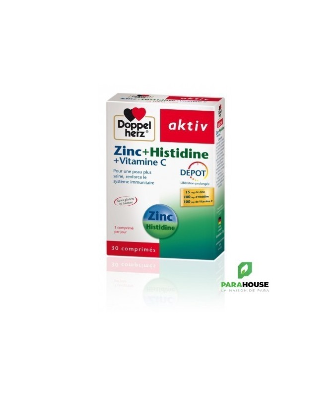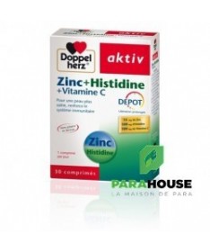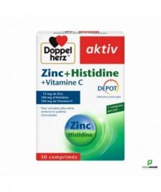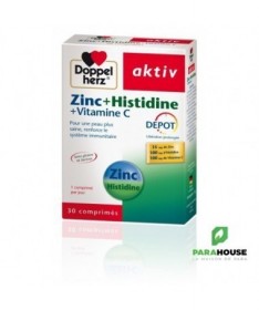 AKTIV Zinc+Histidine + Vitamine C 30CP Les comprimés Zinc Histidine Vitamine C de Doppelherz bénéficient de la technologie innovante DEPOT. Celle-ci consiste en un enrobage spécial qui permet la libération progres-sive des micronutriments sur une période de plusieurs heures, laissant ainsi à l’organisme le temps de pouvoir les assimile Le zinc est un oligoélément clé pour la santé de la peau: en plus d’exercer une action anti-inflammatoire directe au niveau de l’épiderme, le zinc contribue à la croissance et à la résistance des cellules cutanées, des cheveux et des ongles. Il est également indispensable au bon fonctionnement des défenses immunitaires de l‘organisme. La vitamine C est essentielle pour renforcer les défenses de l’organisme. Elle permet à la fois d’activer le système immunitaire et de protéger les cellules contre les dommages provoqués par les radicaux libres. La vitamine C est également nécessaire aux cellules du derme pour synthétiser le collagène qui permet de maintenir la peau souple et lisse. L'Histidine est un acide aminé qui assure une bonne assimilation du zinc par l'organisme. Composition : Cellulose microcristalline (agent de charge), acide L-ascorbique (vitamine C), gluconate de zinc (zinc), L-histidine, hydroxypropylméthylcellulose (agent d’enrobage), mono et diglycérides d’acides gras (émulsifiants), huile de palme (totalement hydrogénée), dioxyde de silicone (agent antiagglomérant), sels de magnésium d’acides gras (agent antiagglomérant), gomme laque (agent d’enrobage), talc (agent antiagglomérant), huile d’olive, oxydes et hydroxydes de fer (colorants), polysorbate 80 (émulsifiant). Sans gluten Sans lactose Conseils d'utilisation: Il est indiqué de prendre 1 comprimé de AKTIV Zinc Histidine Vitamine C par jour en cas de problèmes de peau modérés, en cas d'acné mineure , une cure de 3 mois renouvelables est recommandée. (A partir de 18 ans). Ne pas dépasser la posologie quotidienne recommandée. Les compléments alimentaires ne peuvent pas se substituer à une alimentation équilibrée et variée. Tenir hors de la portée des enfants.