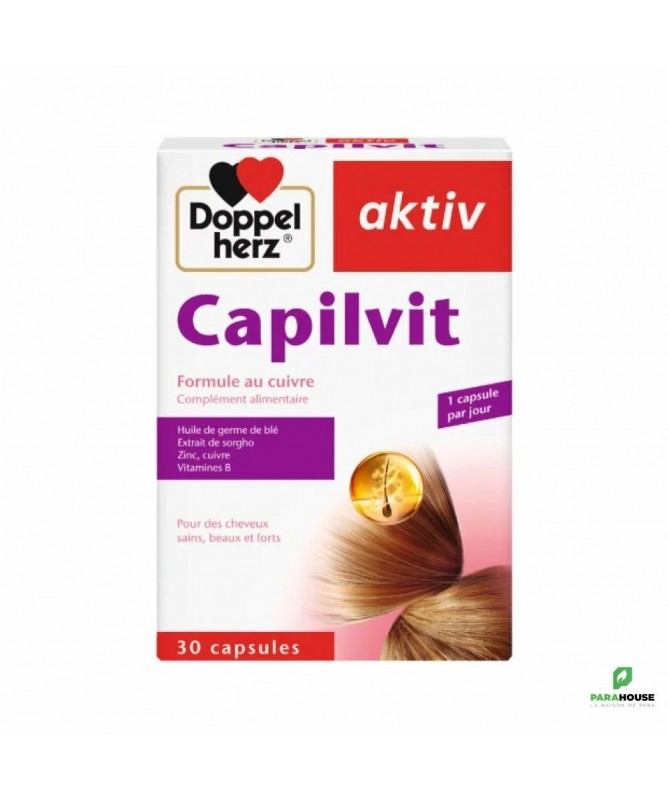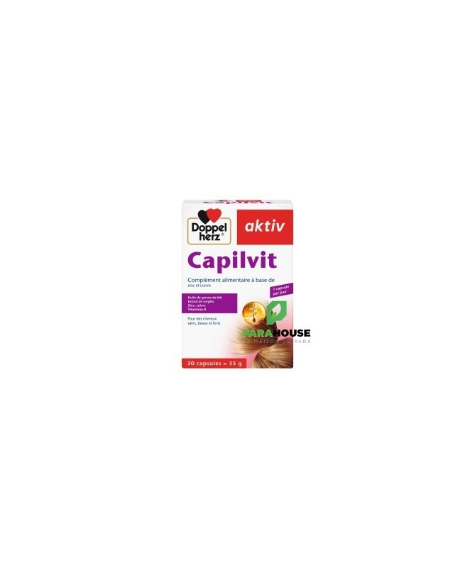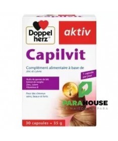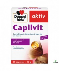 AKTIV CAPILVIT 30 COMPRIMES CAPILVIT est un complément alimentaire pour cheveux sains, beaux et forts. L'aktiv Capilvit est une combinaison spéciale d'extrait de sorgho, d'huile de germe de blé, de biotine, de vitamine B6, d'acide pantothénique, de zinc et de cuivre élaborée pour des cheveux forts et en bonne santé. Le sorgho est une céréale énergétique et nutritive, riche en protéines, en phosphore, en fer et en vitamines du groupe B. L'huile de germe de blé renferme de la vitamine E et des acides gras polyinsaturés qui sont importants pour le développement des cellules de la racine des cheveux. La biotine joue non seulement un rôle majeur pour assurer la résistance des cheveux en pleine croissance, mais participe également à la synthése de la kératine. L'acide pantothénique et la vitamine B6 sont nécessaires pour produire l'énergie nécessaire à la croissance cellulaire, au niveau de la racine. Le zinc joue un rôle important pour maintenir les cellules en bonne santé et lutter contre l'apparition de pellicules. Le cuivre est un oligoélément requis pour la synthése de la mélanine, le pigment qui confére aux cheveux leur brillance. Composition : Huile de germe de blé (Triticum vulgare), gélatine (bovine), extrait de sorgho (Sorghum bicolor), huile de noix de coco, glycérine (humectant), mono- et diglycérides d’acides gras (émulsifiant), sorbitol (humectant), sulfate de zinc, lécithine de soja (émulsifiant), pantothénate de calcium, oxydes et hydroxydes de fer (colorant), chlorhydrate de pyridoxine (vitamine B6), sulfate de cuivre, biotine. Sans lactose Mode d'utilisation: Une fois par jour, après le repas, prendre une capsule avec un grand verre d’eau. Ne pas croquer la capsule. Ne pas dépasser la posologie quotidienne recommandée. Les compléments alimentaires ne peuvent pas se substituer à une alimentation équilibrée et variée. Tenir hors de la portée des enfants.