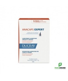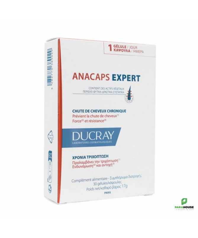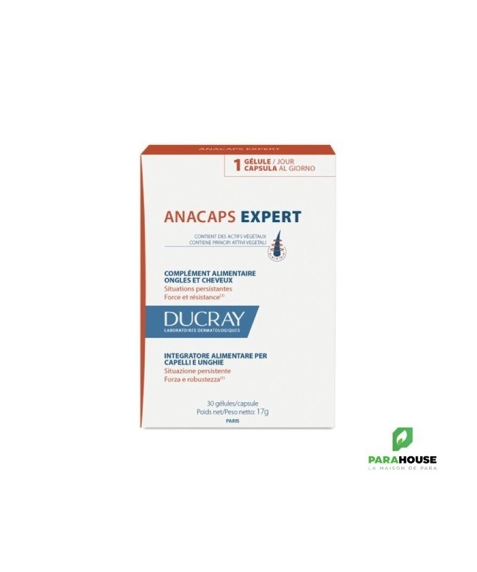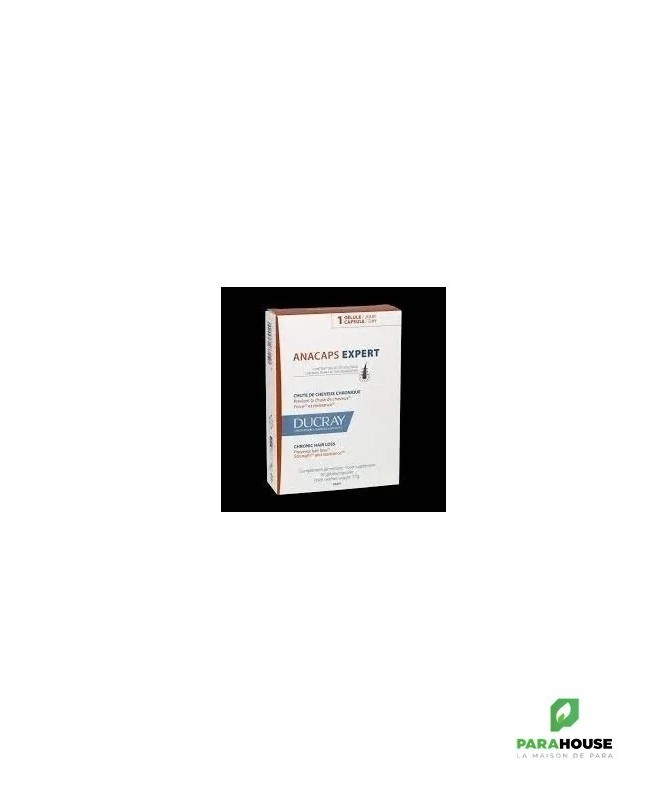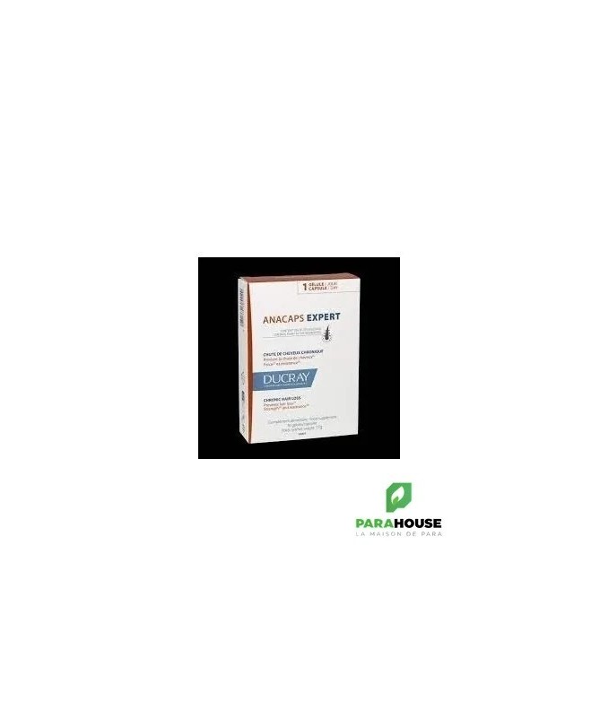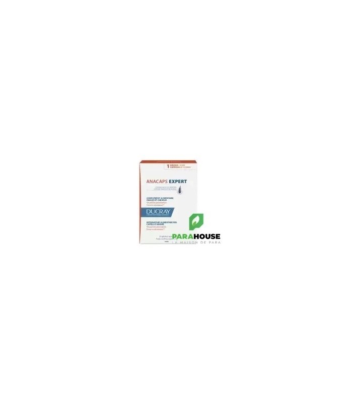 DUCRAY ANACAPS EXPERT 30 GeLules Ducray Anacaps expert aide à apporter au bulbe pilaire et à la matrice des ongles les nutriments essentiels pour maintenir force et vitalité g râce à sa formule originale Redonnez à vos cheveux leur pleine santé en utilisant un traitement avancé contre la perte de cheveux pour une repousse saine À base d'actifs végétaux, d'acides aminés souffrés, de vitamines et minéraux, vegan et gluten-free, ANACAPS EXPERT couvre notamment 80% des besoins en BIOTINE, la vitamine B8. Dans sa formule : du CHEVEU DE VENUS pour aider à freiner la chute¹ et à maintenir des cheveux et des ongles en bonne santé, de la MYRTILLE pour participer à l'activation de la microcirculation² du cuir chevelu, des acides aminés SOUFFRES , et de la vitamine B6 pour aider à la synthèse normale de cysteine et de la BIOTINE (vitamine B8)³ pour maintenir un cheveu normalement fort et résistant, du FER pour aider à réduire la fatigue. Composition : CYSTINE ET MÉTHIONINE : Acides aminés entrant dans la composition de la kératine, qui est la principale protéine constitutive du cheveu et des ongles CHEVEU DE VENUS : Actif qui aide à maintenir les cheveux et les ongles en bonne santé et à prévenir la chute des cheveux. Formule détailée (INCI) : Extrait de cheveux de Vénus (Adiantum capillus-veneris L.), L-cystine, DL-méthionine, Envleoppe de la gélule : Hydroxypropylméthylcellulose, Maltodextrine, Extrait sec de myrtille (Vaccinium myrtillus L.), Sulfate de zinc monohydraté, Extrait de chardon marie (Silybum marianum (L.) Gaertn.), Agent de charge : Cellulose microcristalline, Sulfate ferreux séché, Anti-agglomérant : Stéarate de magnésium, D-pantothénate de calcium, Chlorhydrate de pyridoxine, D-biotine. Conseils d'utilisation : Il est indiqué d'avaler 1 capsule de ANACAPS expert le matin avec un grand verre d’eau. Ne pas dépasser la dose journalière indiquée. La prise de ce complément alimentaire ne doit pas se substituer à un régime alimentaire varié, équilibré et à un mode de vie sain. Ne pas laisser à la portée des enfants. Pendant 3 mois, à renouveler. Réservé à l’adulte et adolescent à partir de 15 ans, déconseillé chez les femmes enceintes ou allaitantes, chez les personnes sous anti-diabétiques ainsi que souffrant de maladies ayant pour conséquence une accumulation anormale de fer Ne pas laisser à la portée des enfants Ne pas dépasser la dose journalière indiquée Conserver à l’abri de la lumière dans un endroit sec et frais, à une température ne dépas