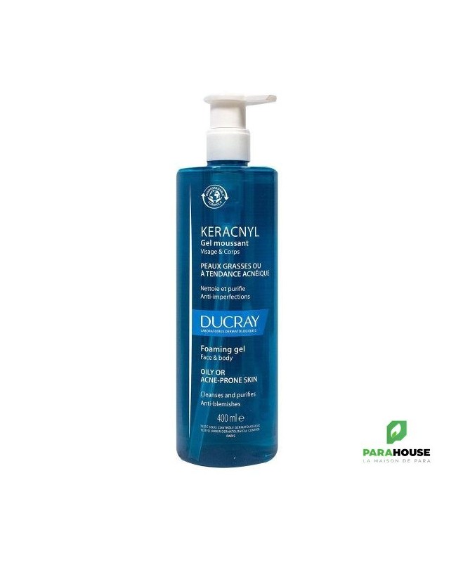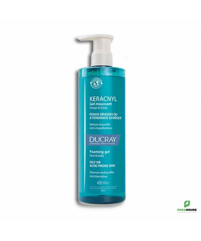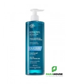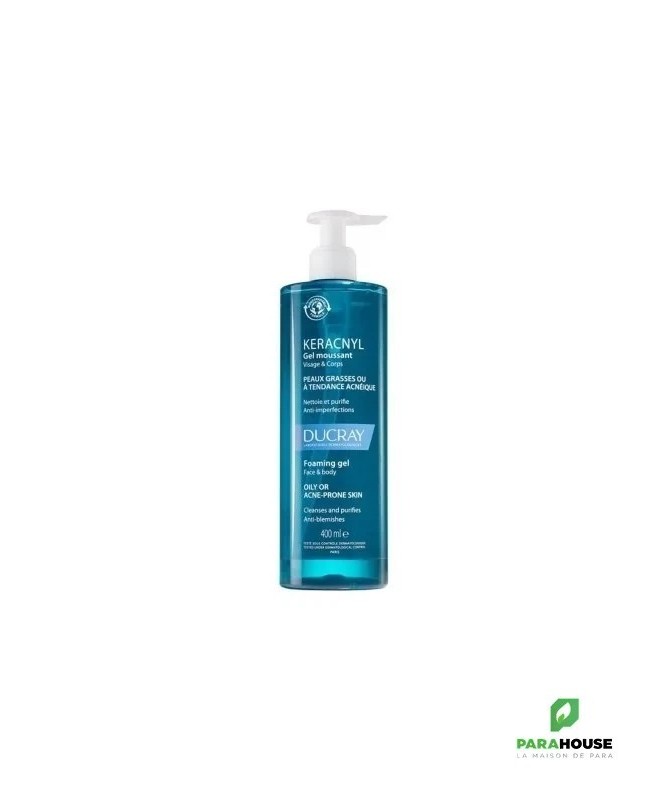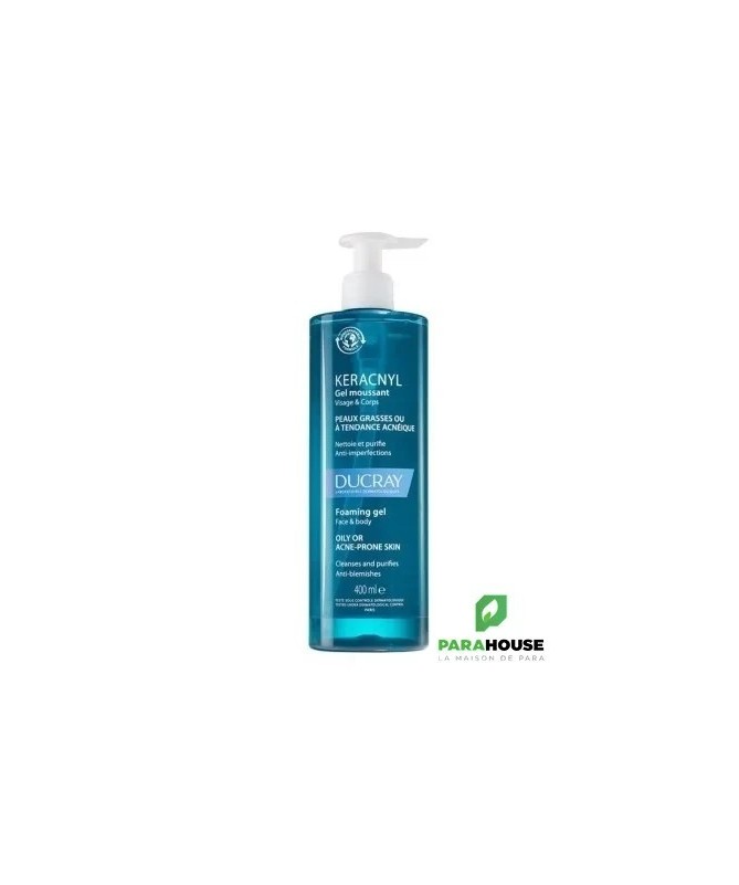 DUCRAY KERACNYL GEL MOUSSANT Visage et Corps 400ML: DUCRAY KERACNYL GEL MOUSSANT nettoie en douceur le visage et le corps sans dessécher, laissant la peau douce, apaisée et protégée. Keracnyl gel moussant peut être appliqué deux fois par jour pour une efficacité anti-imperfections et pour préserver la barrière cutanée. DUCRAY KERACNYL GEL MOUSSANT avec FORMULE SANS SAVON, BIODEGRADABLE Composition : WATER (AQUA)ZINC COCETH SULFATE.CETEARETH-60 MYRISTYL GLYCOLGLYCERINLAURYL BETAINE.DECYL GLUCOSIDE.POLYSORBATE 20.TRIDECETH-9,BLUE 1 (CI 42090)CITRIC ACIDFRAGRANCE (PARFUM).GLYCERYL LAURATE,MYRTUS COMMUNIS LEAF EXTRACTPEG-40 HYDROGENATED CASTOR OILPEG-5 ETHYLHEXANOATE.PPG-26-BUTETH-26SODIUM BENZOATE.SODIUM CHLORIDESODIUM HYDROXIDETRISODIUM ETHYLENEDIAMINE DISUCCINATE Sans paraben, hypoallergénique, non comédogène FORMULE SANS SAVON, BIODEGRADABLE Conseils d'utilisation: Il est recommandé de: appliquer Keracnyl gel moussant matin et soir, sur peau humide Faire mousser et bien rincer Eviter le contact avec les yeux Utilisation possible avec différents traitements médicamenteux (tolérance testée en association)