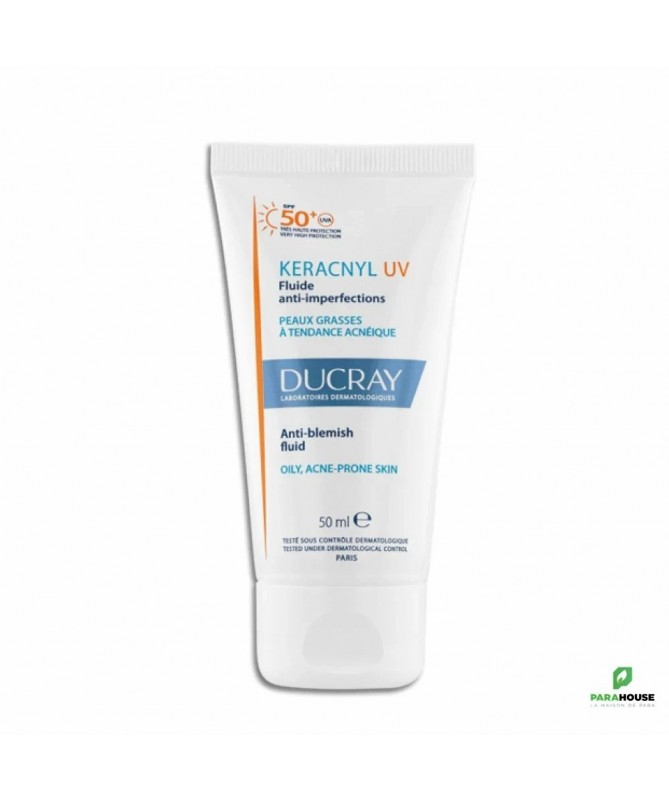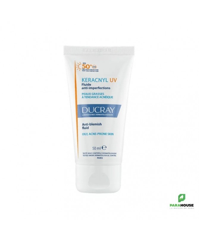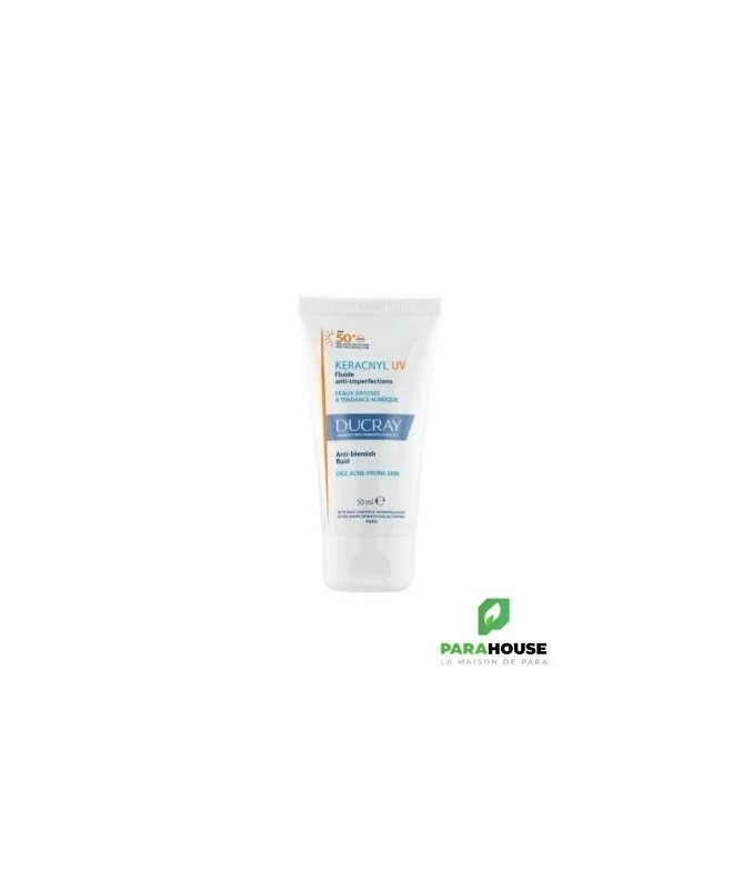 DUCRAY KERACNYL UV Fluide Anti Imperfections 50ML DUCRAY KERACNYL UV Fluide anti imperfections est un soin 2 en 1: protection solaire SPF50+ et soin anti-imperfections qui protège la peau et limite les problèmes des peaux à tendance acnéique exposées au soleil. DUCRAY KERACNYL UV protège la peau des rayons UV et favorise la disparition des imperfections, dans une texture legère au fini mat et grâce à l'action combinée et brevetée de la myrtacine® et du célastrol, 2 actifs d'origine naturelle. KERACNYL UV limite "l'effet rebond" : leur réapparition après l'arrêt de l'exposition aux UV et offre un fini mat, un toucher sec et un contrôle durable de la brillance. le soin solaire KERACNYL résiste à l'eau et à la transpiration, ne laisse pas de traces blanches et constitue une bonne base de maquillage. KERACNYL SPF 50 convient aux adultes et adolescents dès l'âge de 12 ans. Composition : WATER (AQUA). C12-15 ALKYL BENZOATE. DICAPRYLYL CARBONATE. METHYLENE BIS-BENZOTRIAZOLYL TETRAMETHYLBUTYLPHENOL [NANO]. DIISOPROPYL ADIPATE. SILICA. BIS-ETHYLHEXYLOXYPHENOL METHOXYPHENYL TRIAZINE. DIETHYLHEXYL BUTAMIDO TRIAZONE. ZEA MAYS (CORN) STARCH (ZEA MAYS STARCH). BUTYL METHOXYDIBENZOYLMETHANE. C10-18 TRIGLYCERIDES. DECYL GLUCOSIDE. GLYCERIN. GLYCERYL STEARATE. PEG-100 STEARATE. POTASSIUM CETYL PHOSPHATE. ACRYLATES/C10-30 ALKYL ACRYLATE CROSSPOLYMER. BENZOIC ACID. CAPRYLYL GLYCOL. DISODIUM EDTA. FRAGRANCE (PARFUM). GLYCERYL BEHENATE. GLYCERYL DIBEHENATE. GLYCERYL LAURATE. MYRTUS COMMUNIS LEAF EXTRACT. NIACINAMIDE. PENTYLENE GLYCOL. PROPYLENE GLYCOL. SODIUM HYDROXIDE. STEARYL ALCOHOL. TOCOPHEROL. TRIBEHENIN. TRIPTERYGIUM WILFORDII CALLUS EXTRACT. XANTHAN GUM Conseils d'utilisation : Il est recommandé de : Appliquer l'ecran solaire aussi souvent que nécessaire. Renouveler fréquemment pour maitenir la protection, surtout après vous être baigné ou essuyé et avoir transpiré. Ne restez pas trop longtemps au soleil, même si vous utilisez un produit solaire. L'abus de soleil est dangereux. Attention : réduire la quantité conseillée diminue de façon significative la protection apportée