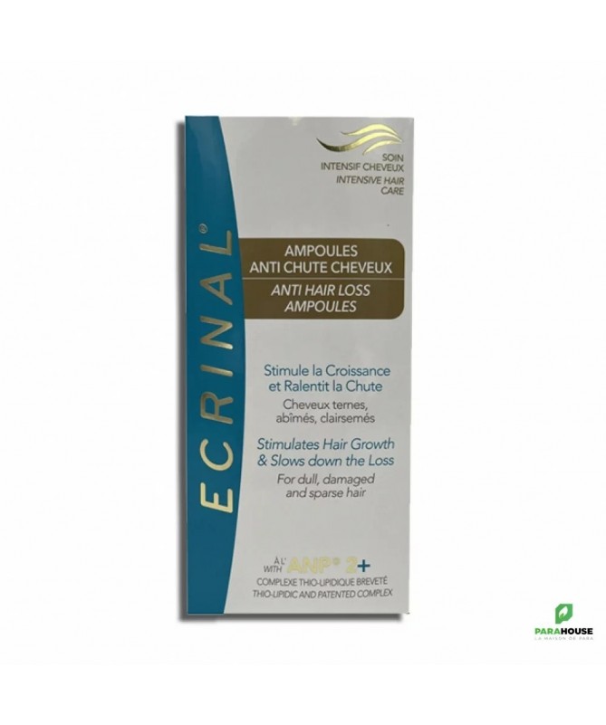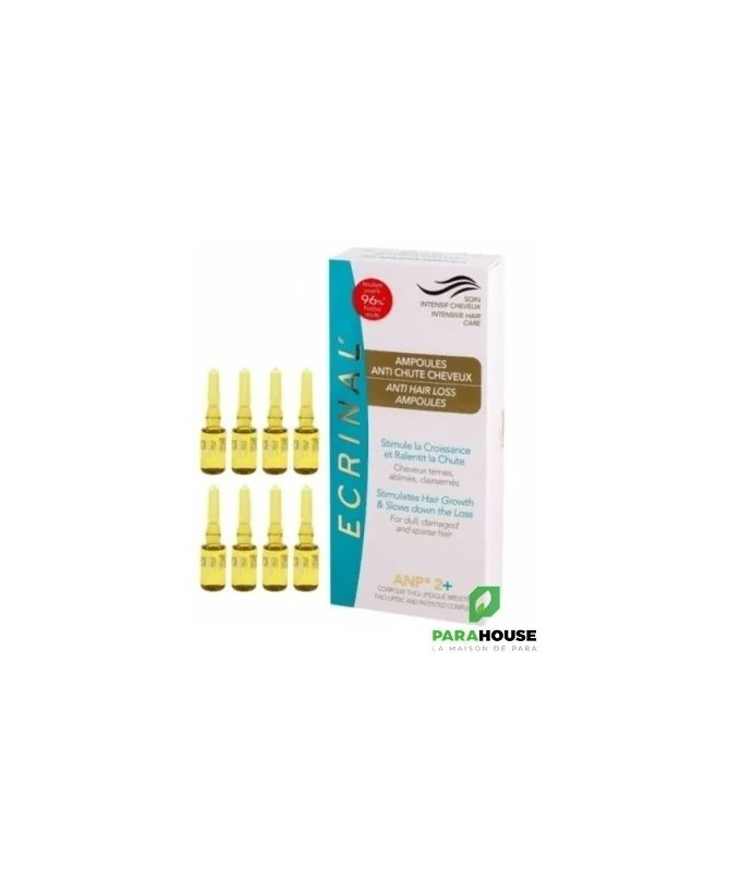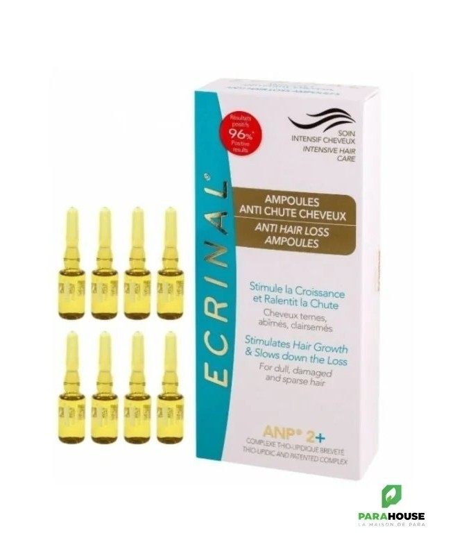 ECRINAL Ampoules Anti Chute Cheveux ECRINAL Ampoules Anti Chute Cheveux est un concentré en A.N.P.2+ (Activateur Naturel de Phanère, actif breveté exclusif des Laboratoires ASEPTA). Les ampoules ecrinal pour cheveux stimulent la repousse des cheveux et atténue leur chute. Il assure également une revitalisation des cheveux faibles et clairsemés. Le cheveu est ainsi sain, plus solide et vigoureux. COMPOSITION : A.N.P®2+ : complexe thio-lipidique breveté CONSEILS D'UTILISATION : Il est indiqué d'appliquer une ampoule de ecrinal anti chute raie par raie sur le cuir chevelu et non sur les cheveux. Exercer un massage doux et prolongé du cuir chevelu. Après 20 minutes, rincer avec le Shampooing ECRINAL® à base d’A.N.P®2+. Il est aussi possible de laisser agir la solution toute une nuit. Le traitement d’attaque est comme suit : une ampoule tous les deux jours pendant 2 mois une ampoule tous les trois jours le 3ème mois