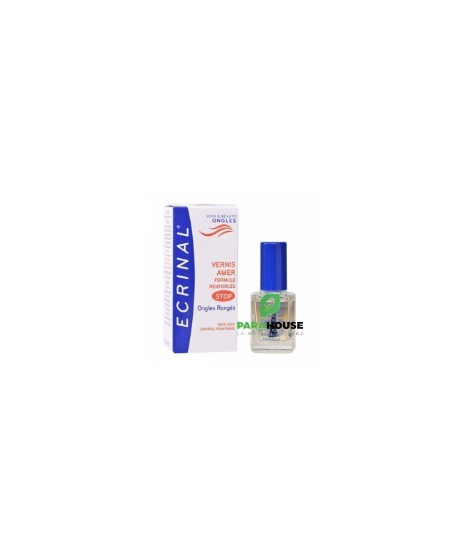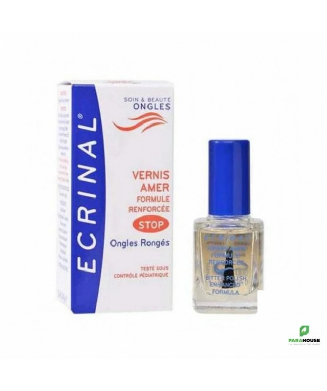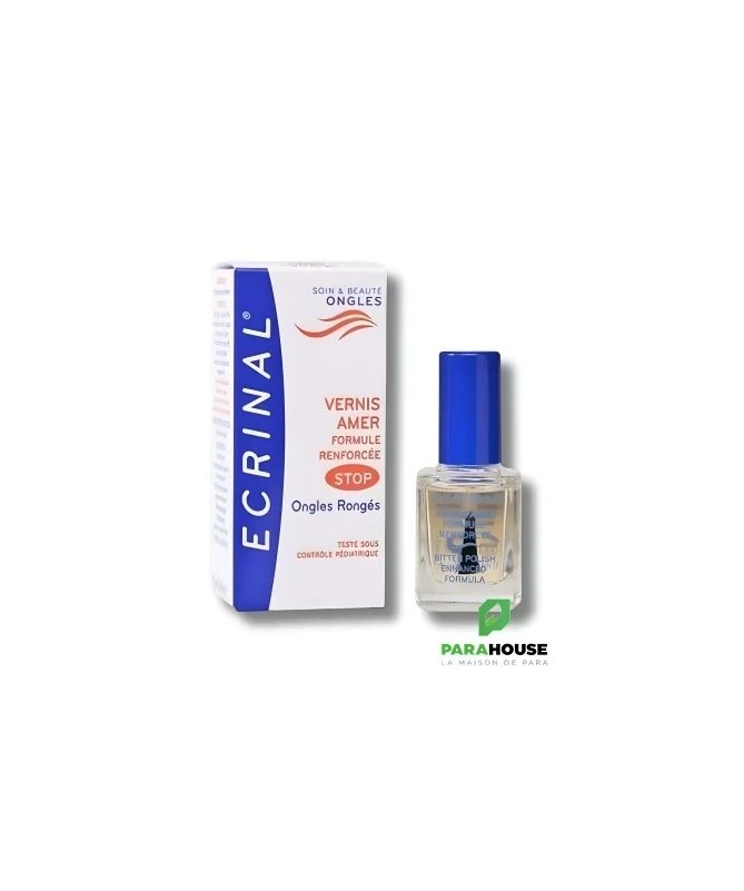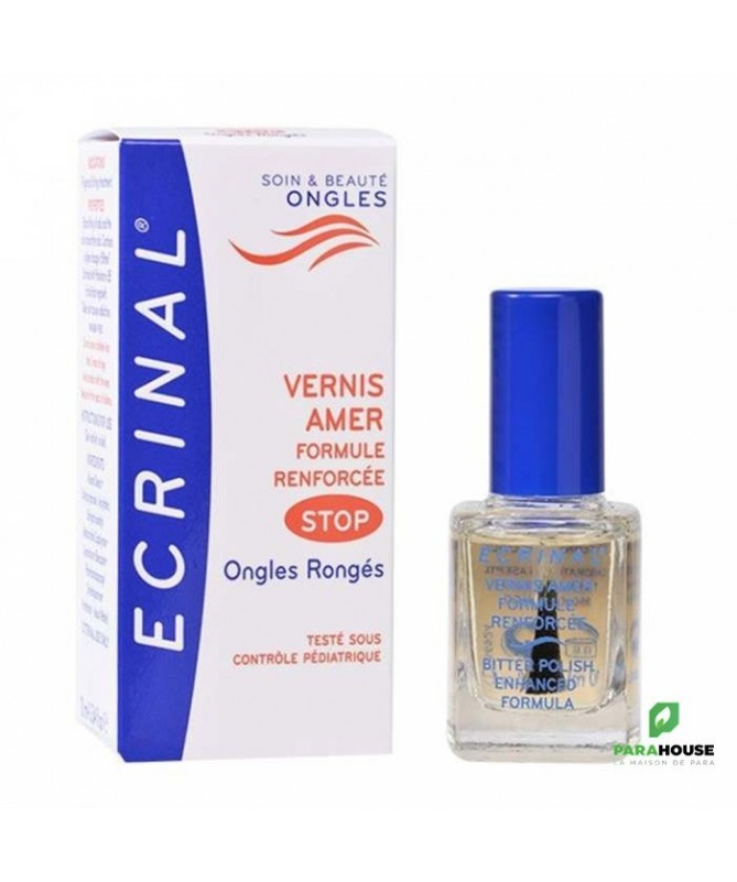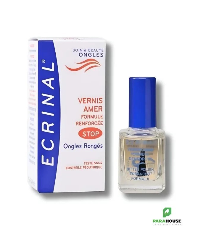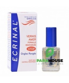 ECRINAL VERNIS AMER STOP AUX ONGLES RONGES 10ML ECRINAL VERNIS AMER STOP AUX ONGLES RONGES est totalement invisible et permet d’empêcher de se ronger les ongles et les peaux du pourtour grâce à son goût extrêmement amer. Il évite ainsi les ongles disgracieux et les risques d’infection. Ce vernis facilite en outre la repousse de l’ongle. Il peut être utiliser chez les enfants à partir de 3 ans pour éviter qu’ils ne sucent leur pouce. Composition : Formule INCI : Alcohol denat., octylacrylamide / acrylates / butylaminoethyl, methacrylate copolymer, palmitamidopropyl dimethylamine, denatonium benzoate, aqua, dimethylaminopropylamine. Conseils d'utilisation : Appliquer sur l’ongle à l’aide du pinceau applicateur. Renouveler l’application chaque jour. Si l’on souhaite enlever ce vernis, utiliser un coton imbibé d’alcool.