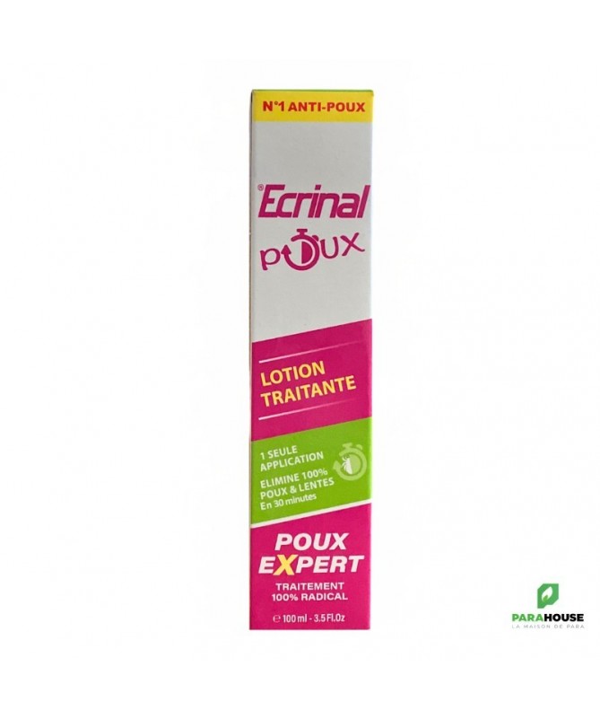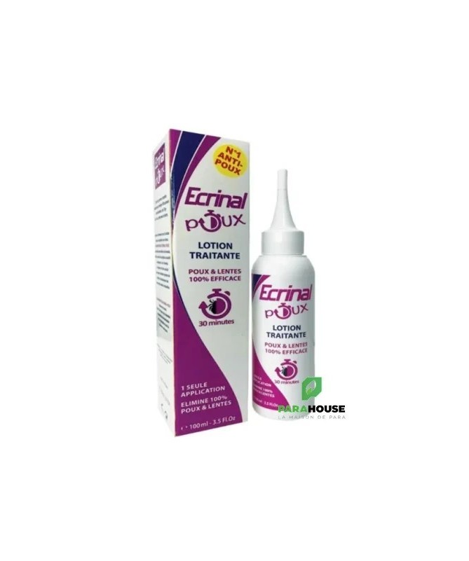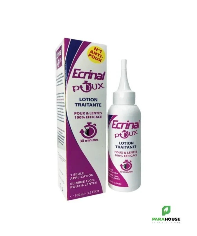 ECRINAL LOTION TRAITANTE ANTI POUX 100ML ECRINAL LOTION TRAITANTE ANTI POUX est spécialement conçue pour éliminer efficacement les poux adultes, les larves et les lentes (les œufs de poux). Elle agit en les étouffant, en les paralysant et en les tuant. Cette lotion est douce pour le cuir chevelu et les cheveux, ce qui la rend adaptée à une utilisation chez les enfants et les personnes ayant un cuir chevelu sensible. Elle ne contient généralement pas de produits chimiques agressifs qui pourraient irriter la peau. En résumé, ECRINAL LOTION ANTI POUX est un produit conçu pour éliminer les poux et les lentes, tout en étant doux pour le cuir chevelu. Il est important de l’utiliser conformément aux instructions du fabricant pour garantir une efficacité maximale dans le traitement des infestations de poux. Composition : Complexe d’essences naturelles 0,4g , huile essentielle de lavande , huile essentielle de cèdre , huile essentielle de santal , huile essentielle d’eucalyptus , huile essentielle de palmarosa , huile essentielle de petit-grain (Oranger bigaradier) , huile essentielle de benjoin. Conseils d'utilisation : Avant d’utiliser la lotion, lisez attentivement les instructions fournies par le fabricant. Bien comprendre toutes les étapes du traitement. Choisissez un endroit bien éclairé et bien ventilé pour l’application de la lotion. Protégez les vêtements avec une serviette ou un tablier pour éviter les taches. Peignez les cheveux pour éliminer les nœuds et les enchevêtrements. Suivez les instructions spécifiques du produit pour l’application de la lotion. En général, vous devez appliquer la lotion de manière généreuse sur les cheveux, en insistant sur le cuir chevelu et les zones où les poux sont plus susceptibles de se cacher. Respectez le temps de pose recommandé par le fabricant. Généralement, il est conseillé de laisser la lotion agir pendant 10 à 15 minutes. Ne dépassez pas ce temps, car cela pourrait être irritant pour le cuir chevelu.