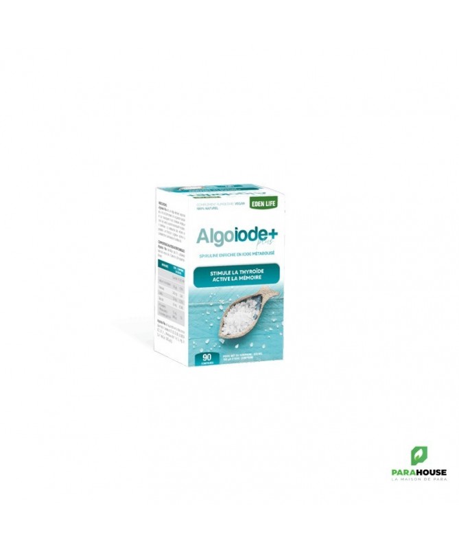 EDEN LIFE ALGO IODE PLUS 90 Comprimes EDEN LIFE ALGO IODE PLUS est composé de 100% Spiruline naturelle cultivée dans son milieu enrichi en Iode. La spiruline absorbe cet oligoélément en le complexant avec ses propres acides aminés (Iode amino-compléxé) et constitue alors une source idéale en iode particulièrement assimilable et présentant une haute tolérance intestinale et une biodisponibilité optimale. L’Iode est un oligo-élément essentiel pour le fonctionnement de la glande thyroïde et par conséquent fortement impliqué dans l’activité du système hormonal thyroïdien. Il contribue à la croissance des enfants et possède une fonction cognitive comme la concentration, la mémoire et la réaction. Nécessaire à la production des hormones thyroïdiennes. Joue un rôle dans la régulation du métabolisme cellulaire. Favorise la croissance des enfants. Participe au fonctionnement normal du système nerveux. Possède une fonction cognitive comme la concentration, la mémoire et la réflexion. Contribue au maintien d’une peau normale. Conseils d'utilisation : Les apports quotidiens conseillés en Iode sont de l’ordre de 50 à 90 µg par jour jusqu’à 8 ans, de 100 à 120 µg pour les enfants de 9-16 ans, de 150 µg pour les adultes et de 220 µg pour les femmes enceintes ou allaitantes. Un comprimé fourni les besoins quotidiens d’une personne en chrome. L‘avis d‘un professionnel de santé est fortement recommandé Ne pas dépasser la dose journalière recommandée ou celle prescrite par le médecin. Ce produit est un complément alimentaire à base de Spiruline riche en Iode. Ne se substitue pas à une alimentation variée et équilibrée, ni à un mode de vie sain. A consommer de préférence avant la date mentionnée. À conserver dans un endroit frais et sec. Tenir hors de la portée des enfants. Pour votre santé, pratiquez une activité physique régulière