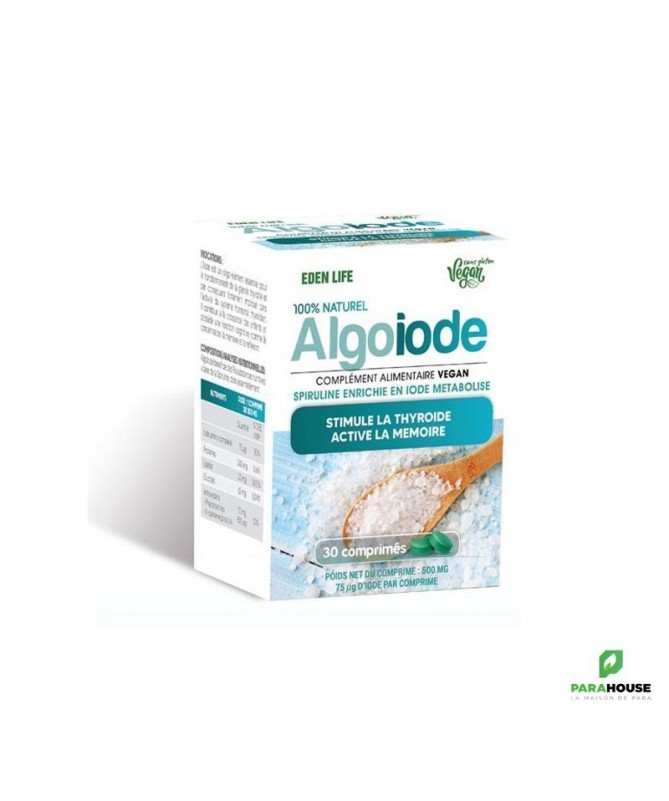 AlgoIode est composé de 100% Spiruline naturelle cultivée dans son milieu enrichi en Iode. La spiruline absorbe cet oligoélément en le complexant avec ses propres acides aminés (Iode amino-compléxé) et constitue alors une source idéale en iode particulièrement assimilable et présentant une haute tolérance intestinale et une biodisponibilité optimale.Nécessaire à la production des hormones thyroïdiennes.Joue un rôle dans la régulation du métabolisme cellulaire.Favorise la croissance des enfants.Participe au fonctionnement normal du système nerveux.Possède une fonction cognitive comme la concentration, la mémoire et la réflexion.Contribue au maintien d’une peau normale.