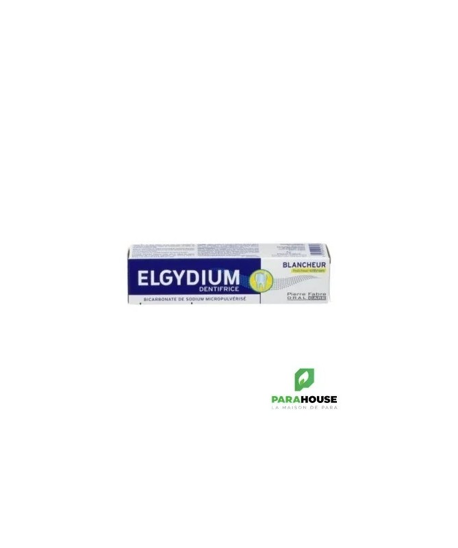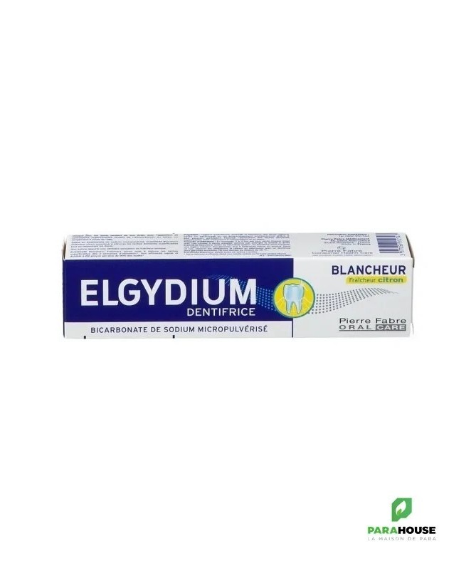 ELGYDIUM DENTIFRICE BLANCHEUR CITRON 75ML ELGYDIUM BLANCHEUR est un aromatisé au citron et contenant du bicarbonate de sodium sous forme micropulvérisée, permettant d’agir jusque dans les sillons les plus fins de l’émail pour un polissage extra-doux et un nettoyage en profondeur. Dans sa formule, du Bicarbonate de sodium micropulvérisé, d’une taille en moyenne cinq fois plus petite que les cristaux classiques de Bicarbonate de sodium, pour pénétrer plus finement dans les sillons de l’émail. Son effet, visible dès deux semaines sur les tâches superficielles des dents, se renforce au fil du temps et des utilisations. Une efficacité rapide et durable a été perçue par 90% des sujets¹. ELGYDIUM DENTIFRICE BLANCHEUR CITRON prolonge la blancheur des dents après un détartrage ou un éclaircissement professionnel, pour encore plus de brillance. Une efficacité rapide et durable et une protection efficace contre les caries. Aromatisé au citron, il rend le brossage de deux à trois minutes, deux à trois fois par jour encore plus agréable. PROLONGE et MAINTIENT la blancheur naturelle des dents après deux semaines d’utilisation. RESPECTE l’émail des dents. AROMATISÉ au citron pour encore plus de fraîcheur. COMPOSITION : WATER (AQUA). GLYCERIN. HYDRATED SILICA. SODIUM BICARBONATE. SODIUM LAURYL SULFATE. CARRAGEENAN. FLAVOR (AROMA). TITANIUM DIOXIDE (CI 77891). TRIETHANOLAMINE. CHLORHEXIDINE DIGLUCONATE. CITRAL. HYDROXYETHYLCELLULOSE. LIMONENE. SODIUM CARBONATE. SODIUM SACCHARIN Conseils d'Utilisation: En brossage de 2 à 3 minutes, 2 à 3 fois par jour, après chaque repas, avec une brosse adaptée, par exemple la brosse ELGYDIUM Blancheur dotée du Microball System.