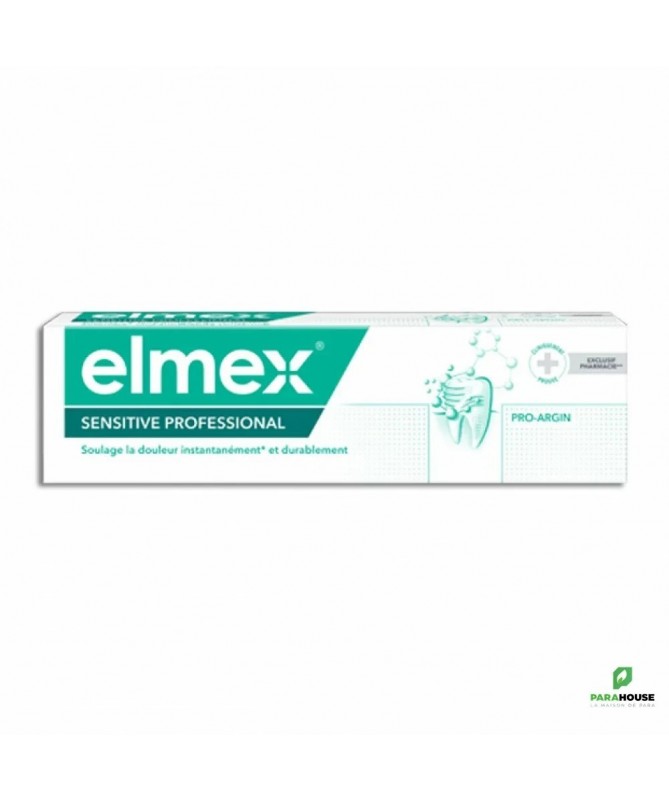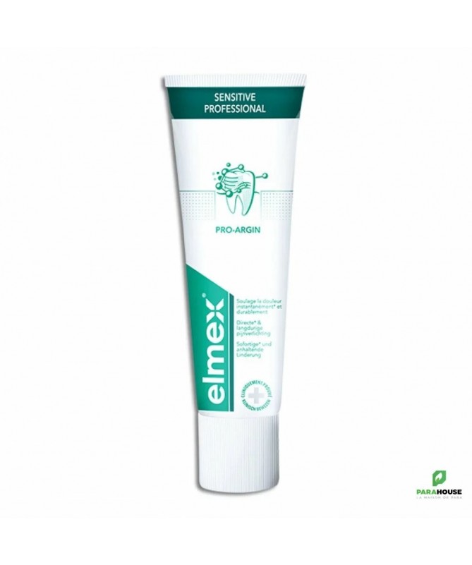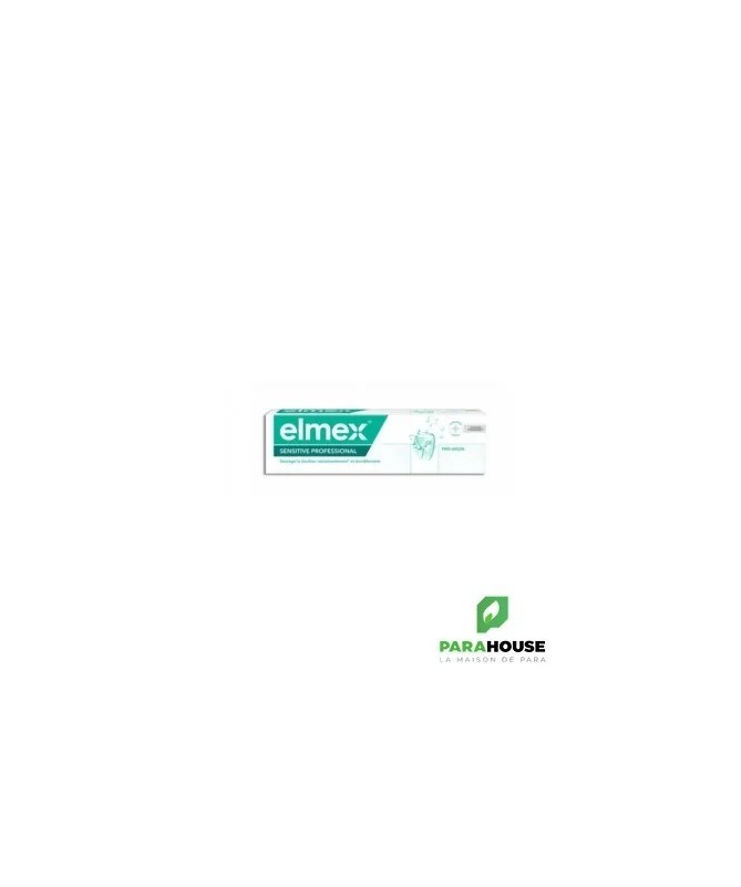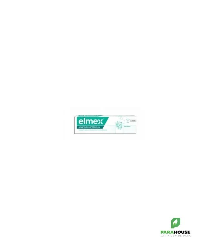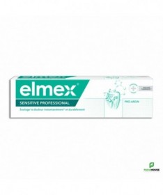 ELMEX SENSITIVE PROFESSIONAL Dentifrice 75ML ELMEX SENSITIVE PROFESSIONAL Dentifrice a été formulé pour apporter un soulagement immédiat aux dents sensibles. La sensibilité dentaire touche bon nombre d'adultes et se caractérise par une réaction disproportionnée à la sensation de froid ou de chaud entraînant ainsi des douleurs. Elmex Sensitive Professional est un dentifrice avec formule Pro-Argin pour dents sensibles et gencives qui saignent facilement. ELMEX SENSITIVE PROFESSIONAL Dentifrice : Efficace pour le soin des dents sensibles. Protège : le fluorure d’amines construit une couche de protection longue durée autour des collets dentaires dénudés. Renforce : le fluorure d’amines renforce vos dents de façon continue, aidant ainsi à les protéger contres les caries. Nettoie : de fines particules offrent un nettoyage efficace et doux pour éliminer la plaque dentaire. Composition : Calcium carbonate, aqua, sorbitol, bicarbonate, sodium lauryl sulfate, sodium monofluorophosphate (1450 ppm F), aroma, cellulose gum, sodium bicarbonate, tetrasodium pyrophosphate, titanium, dioxide, benzyl alcohol, sodium saccharin, xanthan gum, limonene. Conseils d'utilisation : Pour l'hygiène bucco-dentaire quotidienne, après les repas. L'utilisation du dentifrice elmex SENSITIVE est recommandée en association avec la solution dentaire elmex SENSITIVE.