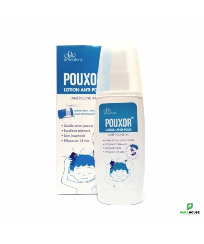 POUXOR LOTION ANTI POUX 100ML POUXOR LOTION ANTI POUX est une lotion anti poux qui élimine les poux de tête et empêche le développement des lentes. C'est une lotion non toxique douce et facile à utiliser. Composition: Diméticone, Cyclométicone 5, Néopentanoate d'isodécyle. Important: Garder les cheveux loin de toutes sources de flamme. Usage externe. Eviter tout contact avec les yeux.