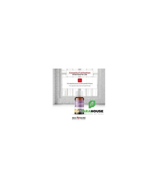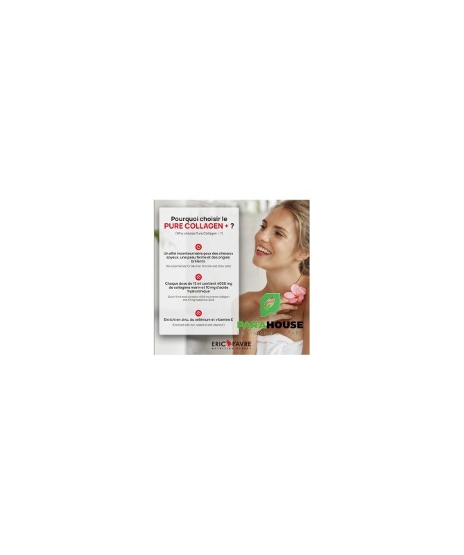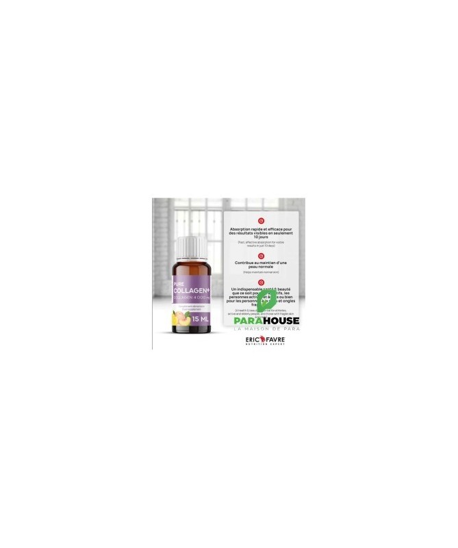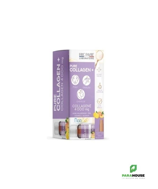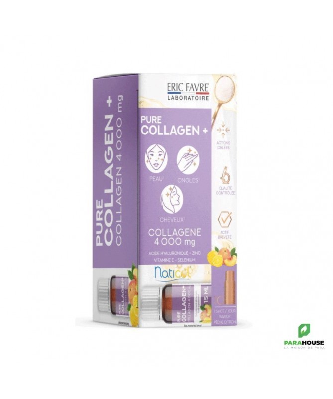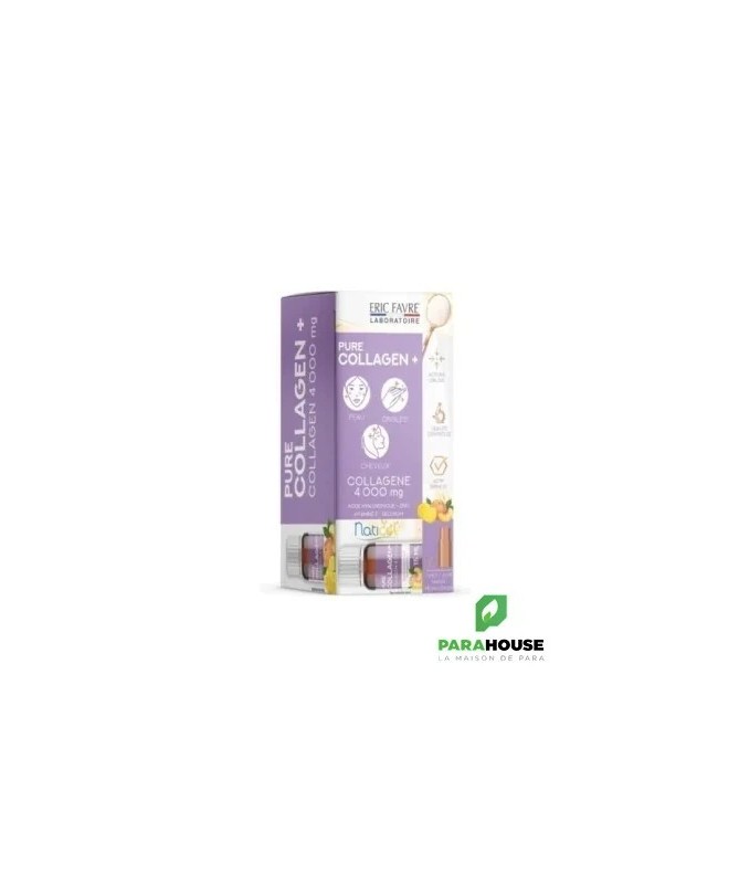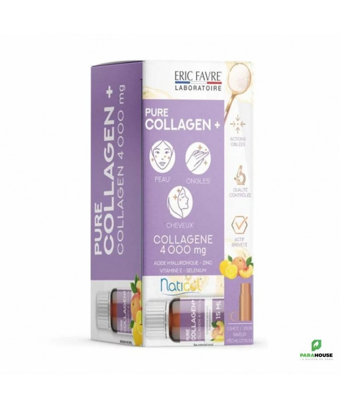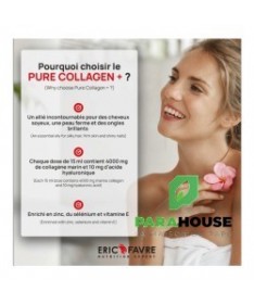 ERIC FAVRE Pure Collagen + 10 unicadoses ERIC FAVRE Pure Collagen + est un complément alimentaire destiné à améliorer la structure de la peau, des cheveux et des ongles. Pure Collagen plus est conçu avec une combinaison avancée de collagène marin, d'acide hyaluronique zinc, vitamine E et sélénium pour maintenir la jeunesse cutanée. Sa formulation a été élaborée à partir des meilleures ressources de la nature pour offrir 10 jours de supplémentation quotidienne avec les meilleurs nutriments pour stimuler le renouvellement cellulaire. Il aide également à prévenir l'apparition des rides et des ridules et contribue au maintien d’une peau, de cheveux et d’ongles normaux. Saveur pêche, citron. Composition : EAU, HYDROLYSAT DE COLLAGENE MARIN (POISSON), FRUCTOSE, ACIDIFIANT : ACIDE CITRIQUE, AROME PECHE, AROME CITRON, CONSERVATEURS : SORBATE DE POTASSIUM, BENZOATE DE SODIUM, ACIDE HYALURONIQUE, SULFATE DE ZINC, VITAMINE E, LEVURE DE SELENIUM, EDULCORANT : SUCRALOSE. conseils d'utilisation : Il est recommandé de prendre 1 à 2 capsules par jour le matin pendant 30 jours.