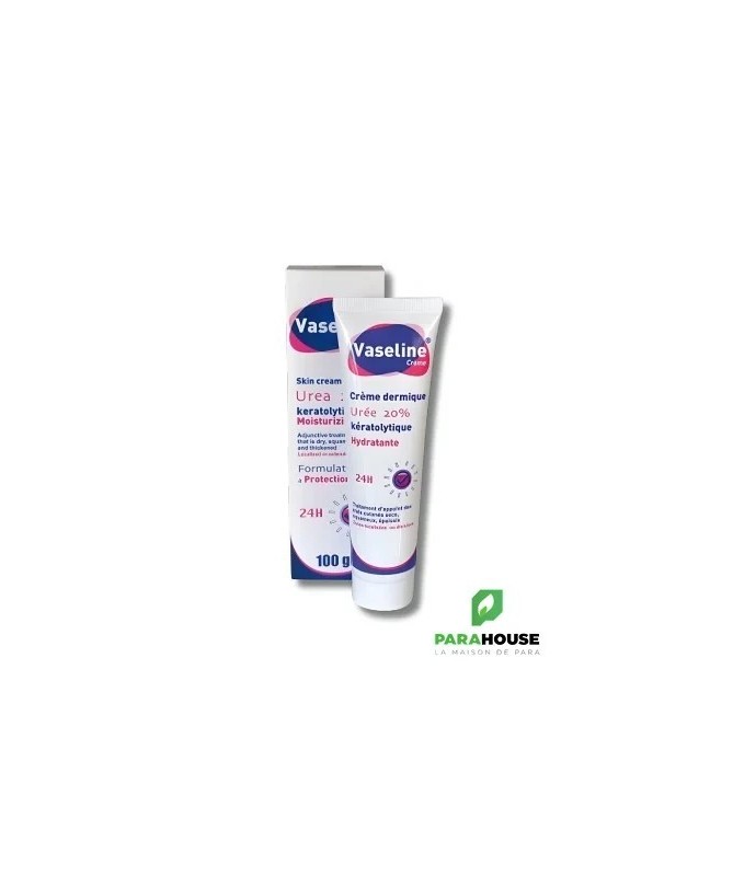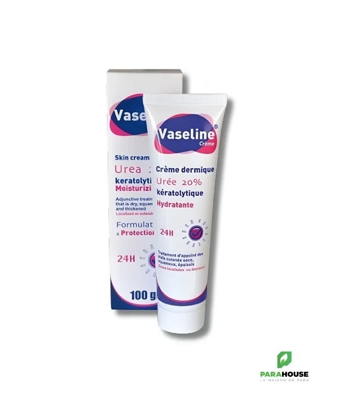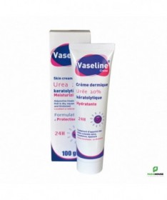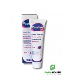 Vaseline Urée - Crème Kératolytique et HydratanteVaseline Urée est une crème kératolytique et hydratante, spécialement conçue pour traiter les états cutanés secs, squameux et épaissis, qu’ils soient localisés ou étendus.Propriétés :- Hydratante: Contribue à restructurer rapidement la barrière lipidique et à restaurer l’hydratation de la peau.- Kératolytique: L’urée élimine efficacement les squames et les cellules mortes, freinant ainsi l’épaississement excessif de la couche cornée.Vaseline Urée est particulièrement recommandée pour les peaux très sèches et les hyperkératoses cutanées, comme celles des paumes des mains, des plantes des pieds, des talons, des coudes et des genoux.Conseils d'utilisation :Appliquez Vaseline Urée quotidiennement, matin et soir, en massant les zones concernées (paumes des mains, plantes des pieds, talons, coudes, genoux, zones pilaires).Pour les pieds très secs, appliquez Vaseline Urée le soir en couche épaisse, puis enfiler une paire de chaussettes en coton et laissez poser toute la nuit.