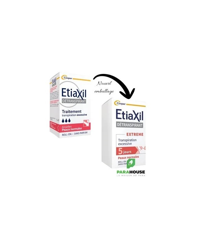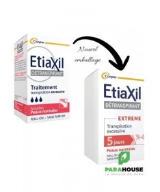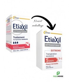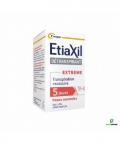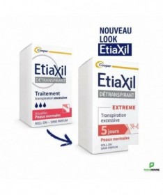 Etiaxil Détranspirant Extreme Aisselles Peaux Normales Roll-on 15ML Etiaxil Détranspirant Extreme est cliniquement prouvé pour contrôler la transpiration excessive pendant plus 5 jours. Ciblé sur les aisselles, il stoppe la transpiration et permet ainsi d'empêcher la sueur d'atteindre vos vêtements, tout en garantissant une efficacité maximale contre la transpiration excessive. Appliqué sur les aisselles, Etiaxil permet de mettre au repos les glandes sudoripares, qui cessent alors de produire de la sueur pendant quelques jours. Il s'agit du produit le plus dosé en actif anti-transpirant pour garantir une efficacité maximale contre la transpiration excessive. Sans parfum, etiaxil aisselles est compatible avec l’usage d’un déodorant ou d’un parfum au quotidien. Efficacité prouvée cliniquement : anti-humidité et anti-odeurs. Composition : Alcohol Denat., Aluminum Chloride, PEG-12 Dimethicone Conseils d'utilisation : Appliquez Etiaxil sous les aisselles en respectant la règle des « 3 S » : Appliquer le Soir Sur une peau Sèche Sur une peau Saine Informations complémentaires : Laissez sécher naturellement à l’air. Le lendemain matin, rincez à l’eau et au savon. En début de traitement, appliquez Etiaxil tous les soirs. Lorsque le niveau de confort souhaité est atteint (normalement en 2 à 3 jours), appliquez Etiaxil 2 à 3 fois par semaine. L’arrêt définitif du traitement entraîne la disparition de l’efficacité du produit et il convient alors de reprendre le traitement depuis le début. Ne pas utiliser ce produit chez l’enfant, sans l’avis et le conseil d’un pharmacien ou d’un médecin
