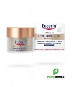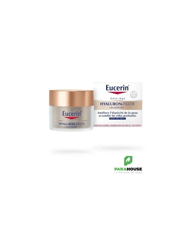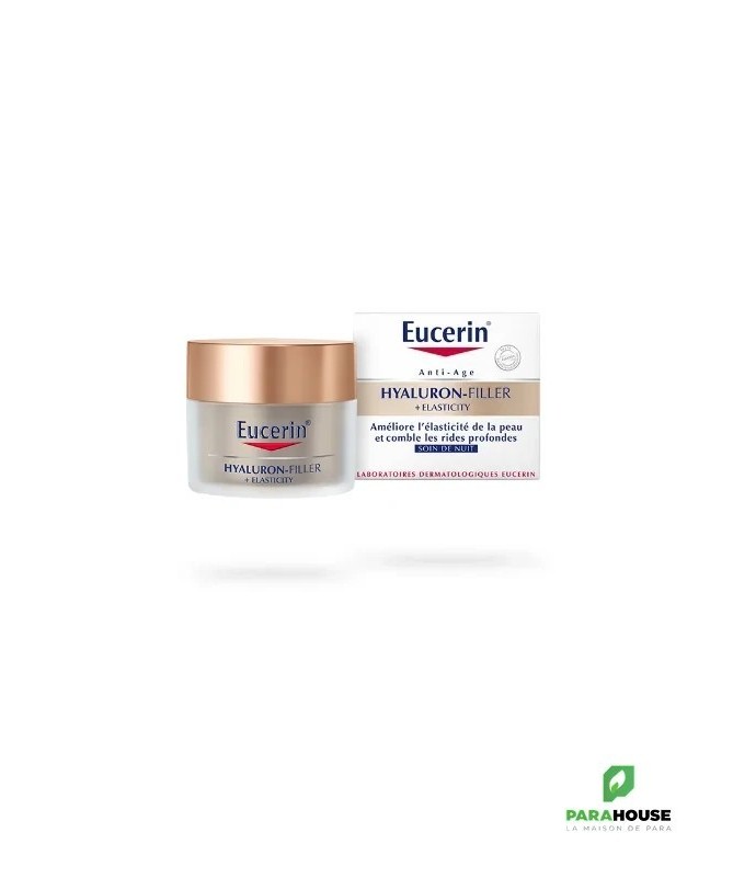 Eucerin Hyaluron-Filler et elasticity est un soin de nuit riche pour les peaux matures qui permet de Renforcer la structure de la peau en améliorant son élasticité et en comblant les rides, même profondes.EUCERIN HYALURON-FILLER + ELASTICITY Soin de Nuit renforce la structure de la peau en améliorant son élasticité et comble les rides. Sa formule unique et innovante fournit de multiples bénéfices anti-âge grâce à la présence d'ingrédients actifs minutieusement choisis. Après utilisation, la peau est plus ferme, elle est visiblement plus fraîche et éclatante, et les rides sont comblées. La formule contient de l'Arctiine (un ingrédient actif qui accélère le renouvellement du collagène dans les cellules de la peau), qui fonctionne en combinaison avec la Silymarine (un antioxydant puissant qui protège le collagène et l'élastine de leur dégradation et améliore la circulation de la peau au niveau cellulaire).La formule contient également de l'Acide Hyaluronique de bas et de haut poids moléculaire afin de combler visiblement les rides.