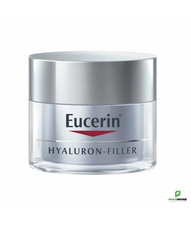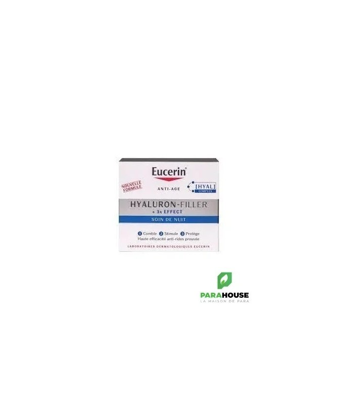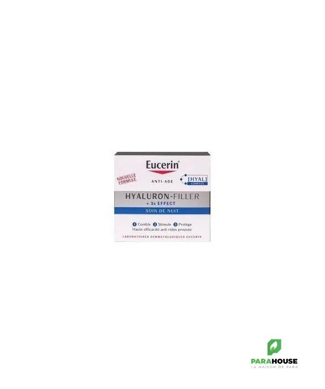 Le soin de nuit Hyaluron-Filler + 3x effect d’Eucerin est un soin anti-âge formulé à base d’un complexe d’ingrédients complémentaires afin de vous offrir une action anti-âge complète. En effet, avec le temps, la production d’acide hyaluronique naturelle de la peau diminue jour après jour. La peau perd en fermeté et des rides et ridules se dessinent petit à petit afin de venir s’installer plus profondément et marquer durablement votre visage. Le soin de nuit Hyaluron-Filler + 3x effect d’Eucerin intègre le complexe Hyal qui va agir durant votre sommeil pour combler vos rides, stimuler la production d’acide hyaluronique et protéger ces molécules. En effet, l’anti-rides Hyaluron-Filler + 3x effect d’Eucerin renferme de l’acide hyaluronique de haut poids moléculaire qui va hydrater les couches supérieures et lisser la peau et de l’acide hyaluronique de bas poids moléculaire qui lui va hydrater la peau plus en profondeur afin de venir cibler et combler les rides profondes. La glycine saponine, un puissant anti-oxydant, va quant à elle agir là où se forment les rides profondes et stimuler la production d’acide hyaluronique afin de raffermir sensiblement et durablement la peau. Enfin, l’enoxolone vient ajouter la touche finale à ce remarquable complexe en limitant la dégradation de l’acide hyaluronique. Résultat : l’action du complexe anti-âge Hyal est encore durable. Le soin de nuit anti-âge Hyaluron-Filler + 3x effect d’Eucerin renferme également du Dexpanthénol qui va compléter l’action anti-âge du complexe Hyal en soutenant la régénération des cellules cutanées. Avec le Soin de nuit Hyaluron-Filler + 3x effect d’Eucerin, vous faites véritablement peau neuve durant la nuit et vous réveillez avec une peau visiblement plus ferme, lissée, qui a retrouvé toute son élasticité et sa beauté.