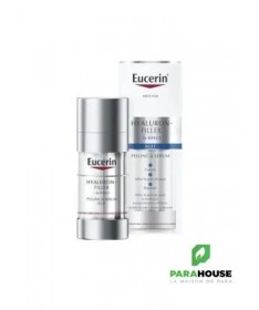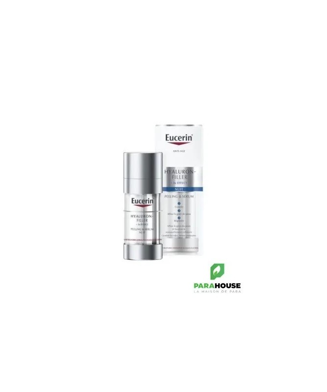 Eucerin Hyaluron-Filler Peeling & Sérum Nuit combine deux formules puissantes pour de multiples bénéfices anti-âge La double efficacité d'un peeling anti-âge et d'un sérum qui exfolie et affine la texture de la peau, favorise le renouvellement cellulaire et comble les rides, même les plus profondes. La peau est plus lumineuse et plus lisse. Eucerin Hyaluron-Filler Peeling & Sérum Nuit combine deux formules puissantes pour de multiples bénéfices anti-âge : Une peau lissée et lumineuse : L'émulsion crémeuse contient un complexe AHA (alpha-hydroxy-acide) efficace et de la Glycine Saponine. Les AHA, dont beaucoup sont connus sous le nom d'acides de fruits, exfolient la peau tandis que la Glycine Saponine favorise la production d'Acide Hyaluronique dans les cellules épidermiques où naissent les rides profondes. Hydratation et comblement des rides: Le gel transparent associe l'Acide Hyaluronique concentré de haut et de bas poids moléculaire. L'Acide Hyaluronique de haut poids moléculaire aide à lisser les couches supérieures de l'épiderme tandis que l'Acide Hyaluronique de bas poids moléculaire (qui est 40 fois plus petit) pénètre plus profondément dans les couches de l'épiderme où naissent les rides plus profondes. Les deux formules se mélangent sur votre peau pour lui donner une sensation de douceur. Ce produit innovant est conçu pour être utilisé pendant la nuit. Il est cliniquement et dermatologiquement prouvé qu'une utilisation régulière d'Eucerin Hyaluron-Filler Peeling & Sérum Nuit affine la texture de la peau et favorise le renouvellement cellulaire tout en comblant les rides, même profondes. La peau est plus lisse, plus lumineuse et les pores sont resserés.